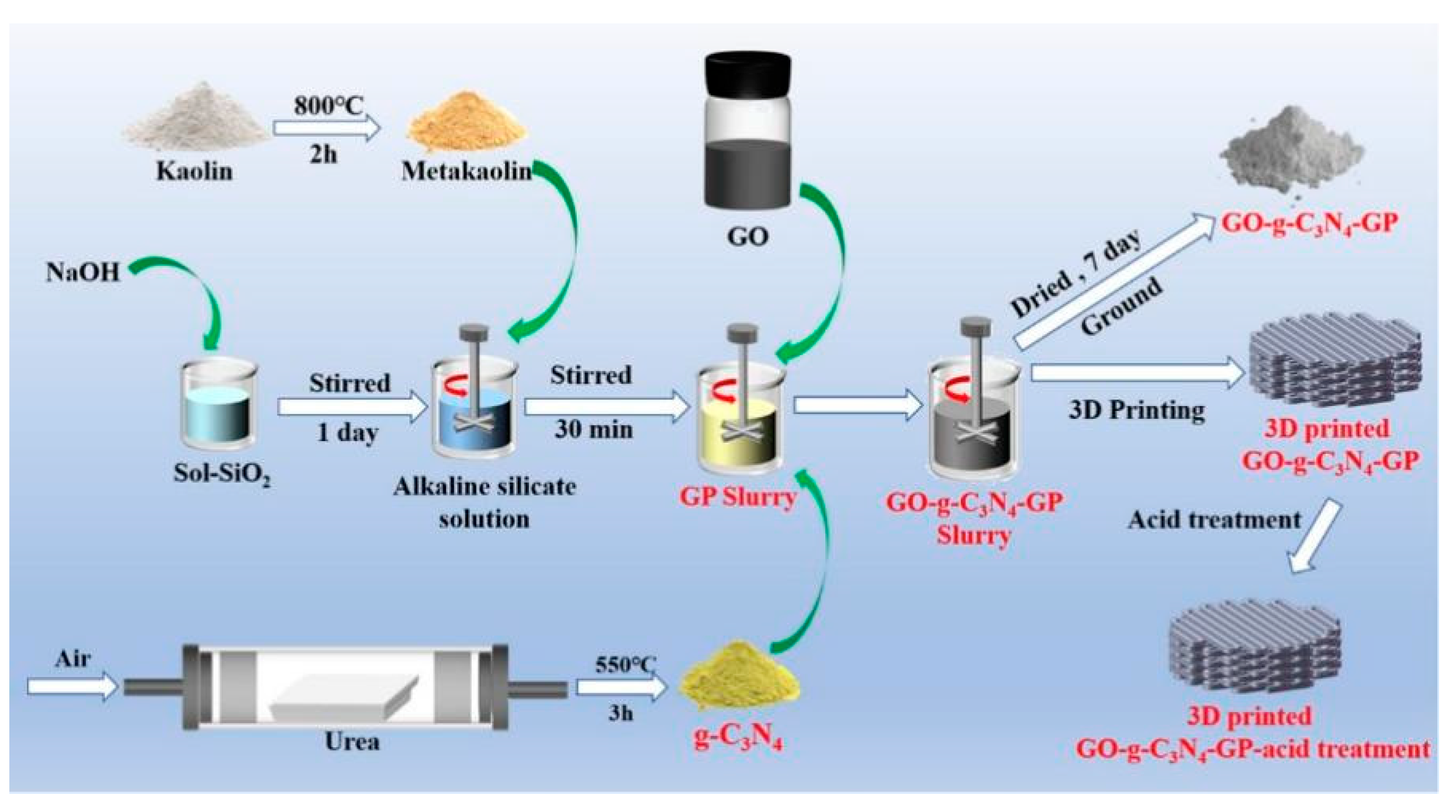 - Alvi, I.H.; Li, Q.; Hu, H.; Onyekwena, C.C.; Hou, Y.; Hakuzweyezu, T.; Iftikhar, S.; Chen, B. A Critical Review of the Advancements in Acid-Activated Metakaolin Geopolymers. Constr. Build. Mater. 2024, 421, 135609. [Google Scholar] [CrossRef]