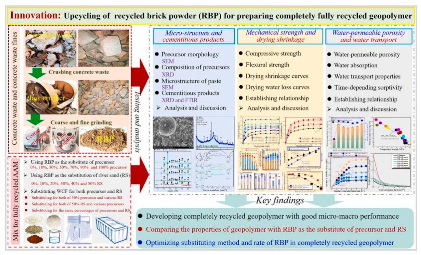 - Ma, Z.; Wu, Y.; Yang, D.; Fang, K.; Hou, S.; Dai, Y.; Wang, C. Upcycling of Recycled Brick Powder as a Substitute for Precursor and Sand in Completely Recycled Geopolymer: From Micro to Macro Perspective. Constr. Build. Mater. 2025, 476, 141300. [Google Scholar] [CrossRef]
