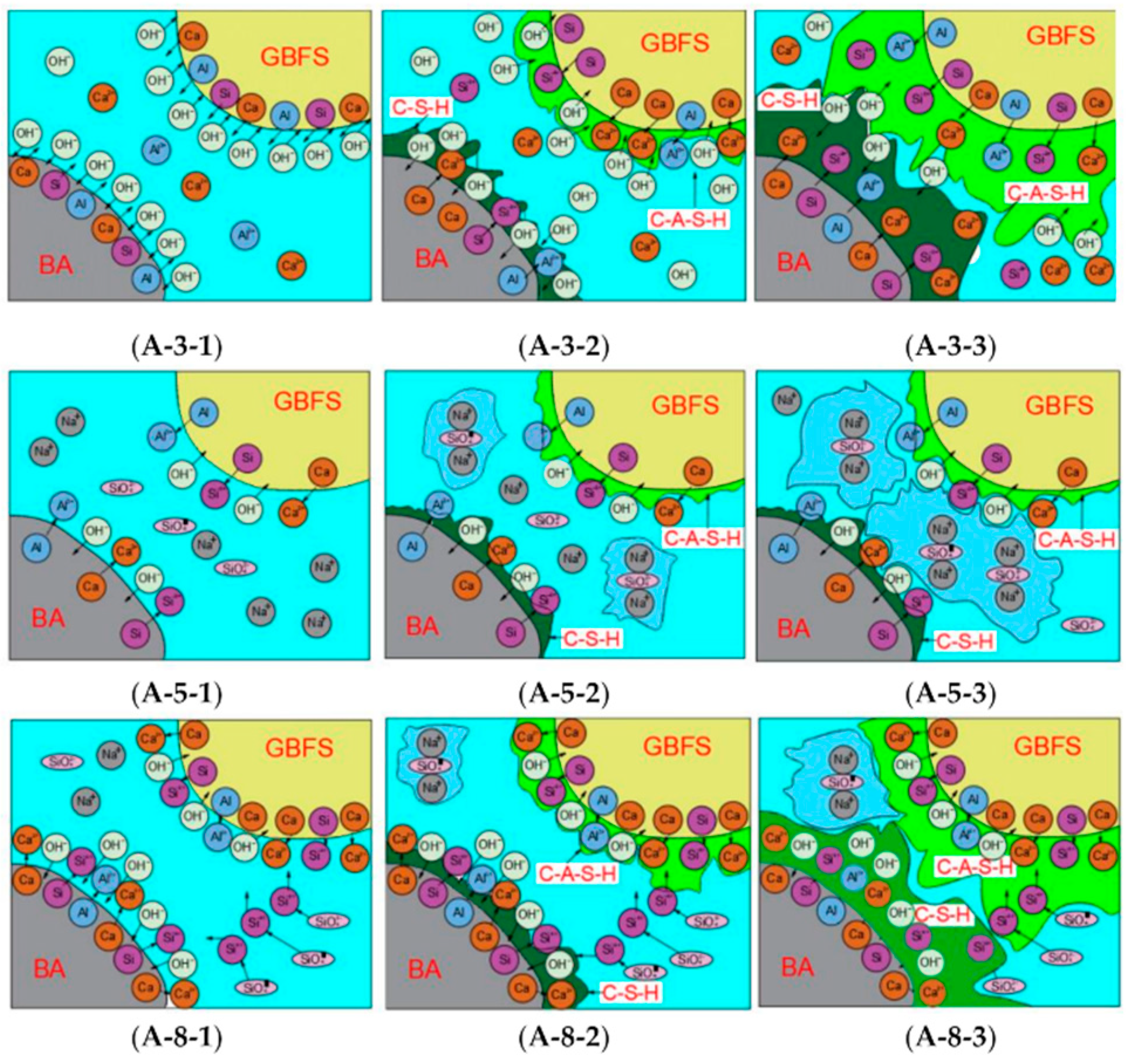 - Yuan, J.; Li, L.; He, P.; Chen, Z.; Lao, C.; Jia, D.; Zhou, Y. Effects of Kinds of Alkali-Activated Ions on Geopolymerization Process of Geopolymer Cement Pastes. Constr. Build. Mater. 2021, 293, 123536. [Google Scholar] [CrossRef]