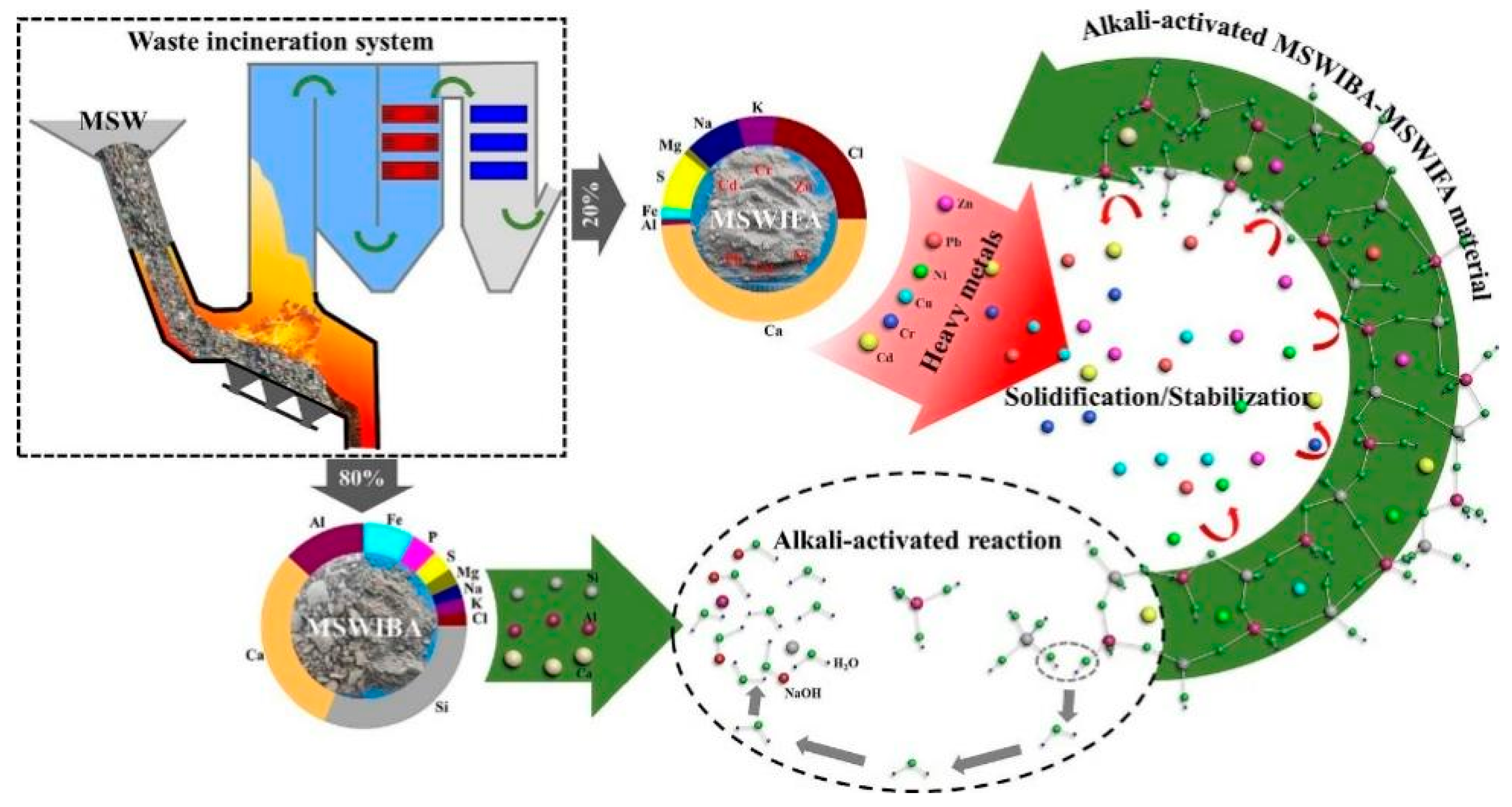 - Liu, J.; Xie, G.; Wang, Z.; Zeng, C.; Fan, X.; Li, Z.; Ren, J.; Xing, F.; Zhang, W. Manufacture of Alkali-Activated Cementitious Materials Using Municipal Solid Waste Incineration (MSWI) Ash: Immobilization of Heavy Metals in MSWI Fly Ash by MSWI Bottom Ash. Constr. Build. Mater. 2023, 392, 131848. [Google Scholar] [CrossRef]