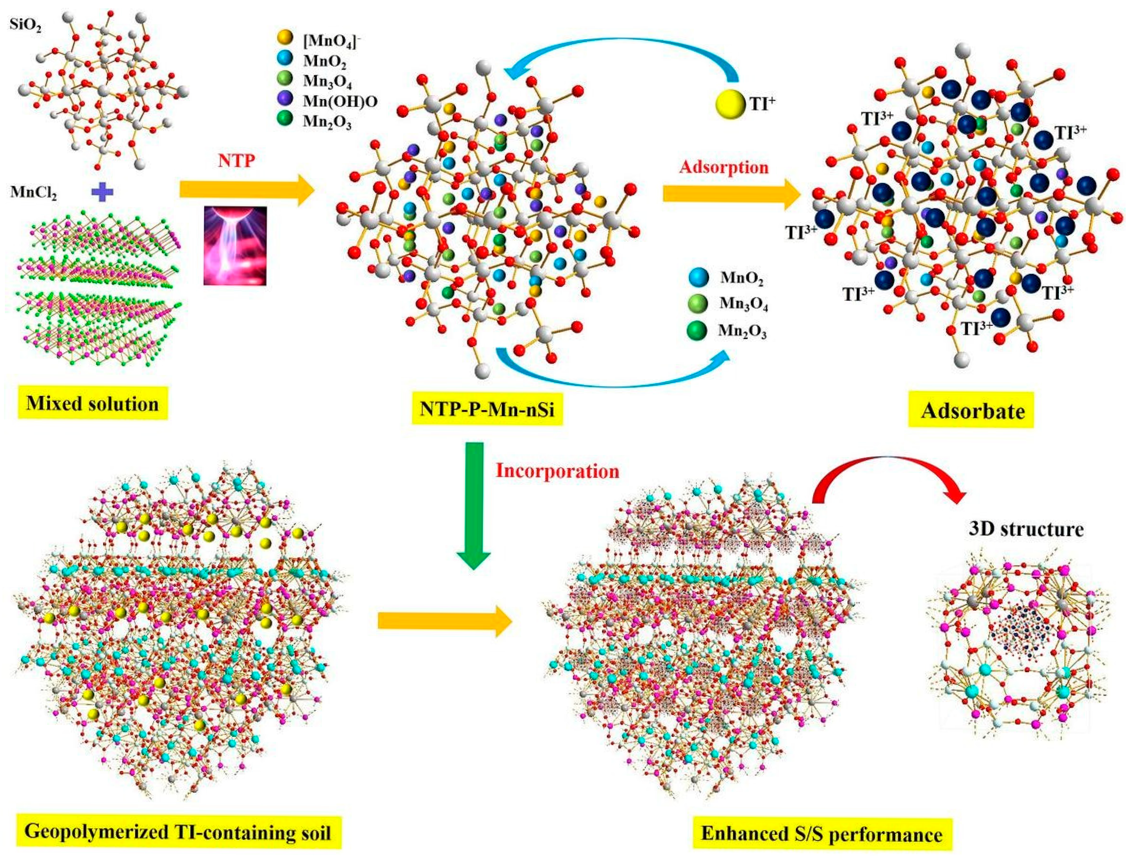 - Huang, T.; Song, D.; Fang, Q.; Yang, C.; Wu, D.; Li, S.; Luo, Y.; Yan, Y.; Hu, Z. Synthesis of Nonthermal Plasma-Irradiated Polyvalent Manganese (Hydro)Oxide Functionalized Nanosilica for Intensifying Geopolymerized Solidification/Stabilization of Thallium-Contaminated Soil and Mechanism Exploration. Chem. Eng. J. 2023, 469, 143751. [Google Scholar] [CrossRef]