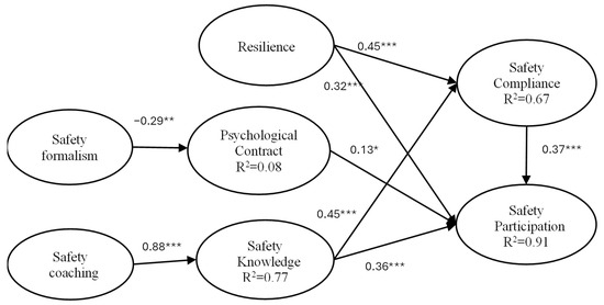 The indirect effect of safety coaching on safety participation through safety knowledge was 0.32 (p < 0.001), while the total effect of safety coaching on safety participation was 0.46 (p < 0.001). The indirect effect of safety coaching on safety compliance via safety knowledge was 0.39 (p < 0.001), and the total effect of safety coaching on safety compliance was also 0.39 (p < 0.001). The indirect effect of safety knowledge on safety participation through safety compliance was 0.16 (p = 0.004), whereas the total effect of resilience on safety participation was 0.49 (p < 0.001).