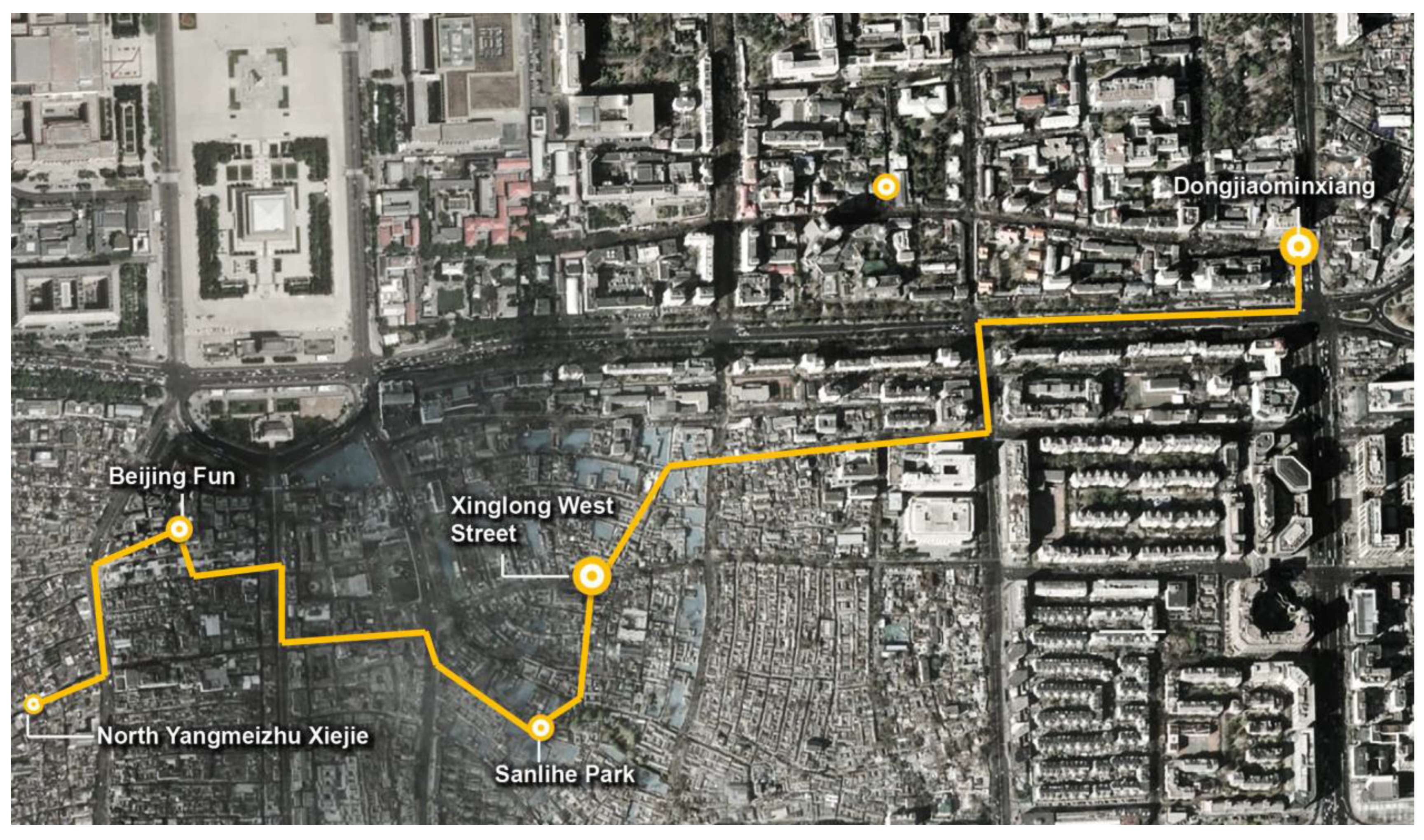| Route 3 | Dongjiaominxiang → Xinglong West Street → Sanlihe Park → Beijing Fun → North Yangmeizhu Xiejie | Diplomatic history, cultural–commercial spaces | |