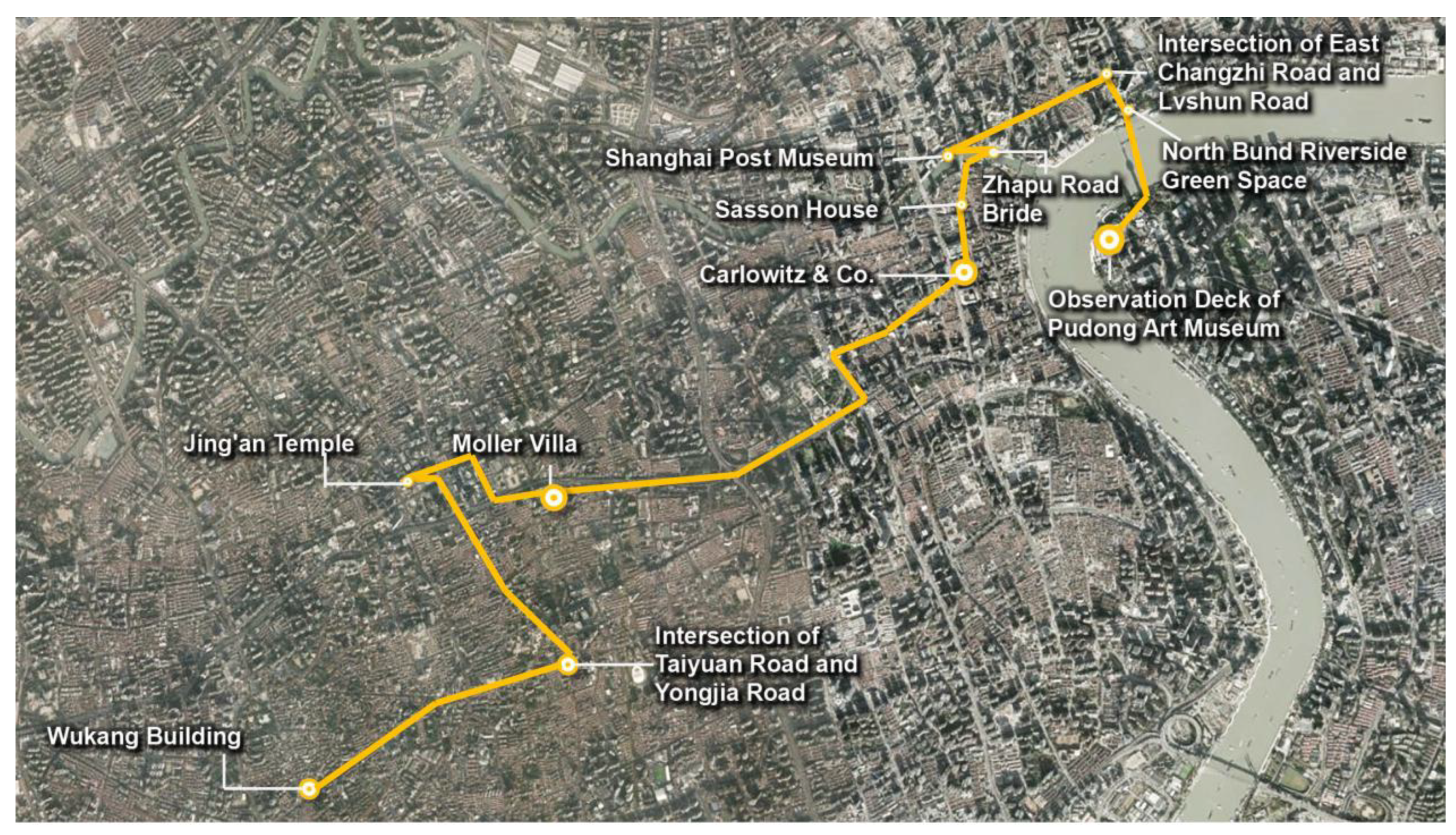 | Route 5 | Wukang Building → Intersection of Taiyuan Road and Yongjia Road → Jing’an Temple → Moller Villa → Carlowitz & Co. → Sassoon House → Zhapu Road Bridge → Shanghai Post Museum → Intersection of East Changzhi Road and Lvshun Road → North Bund Riverside Green Space → Observation Deck of Pudong Art Museum | Historic villas, religious landmarks, art hubs | |