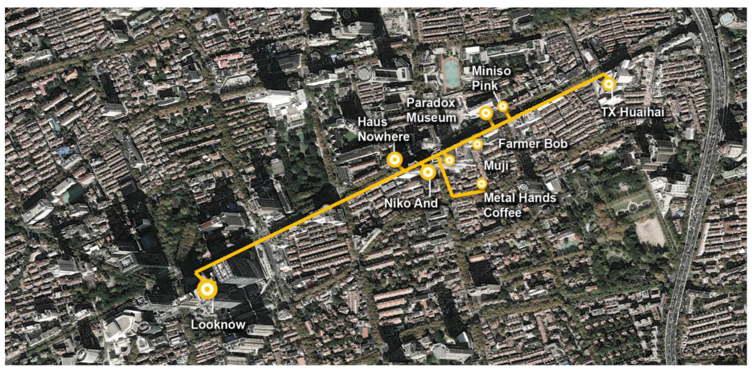 | Route 6 | Looknow → Haus Nowhere → Paradox Museum → Niko And → Muji → Miniso Pink → Farmer Bob → TX Huaihai → Metal Hands Coffee | Contemporary lifestyle, retail & coffee culture | |