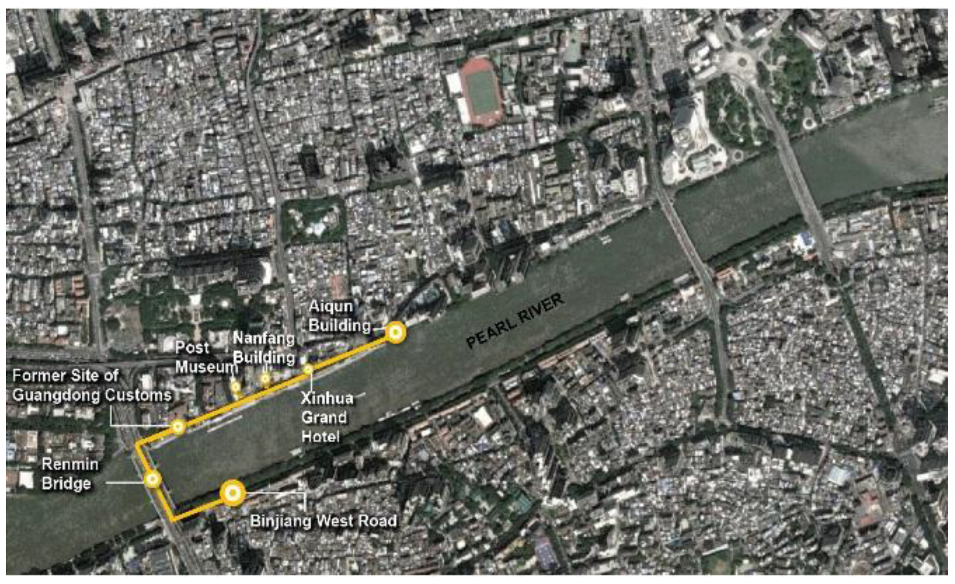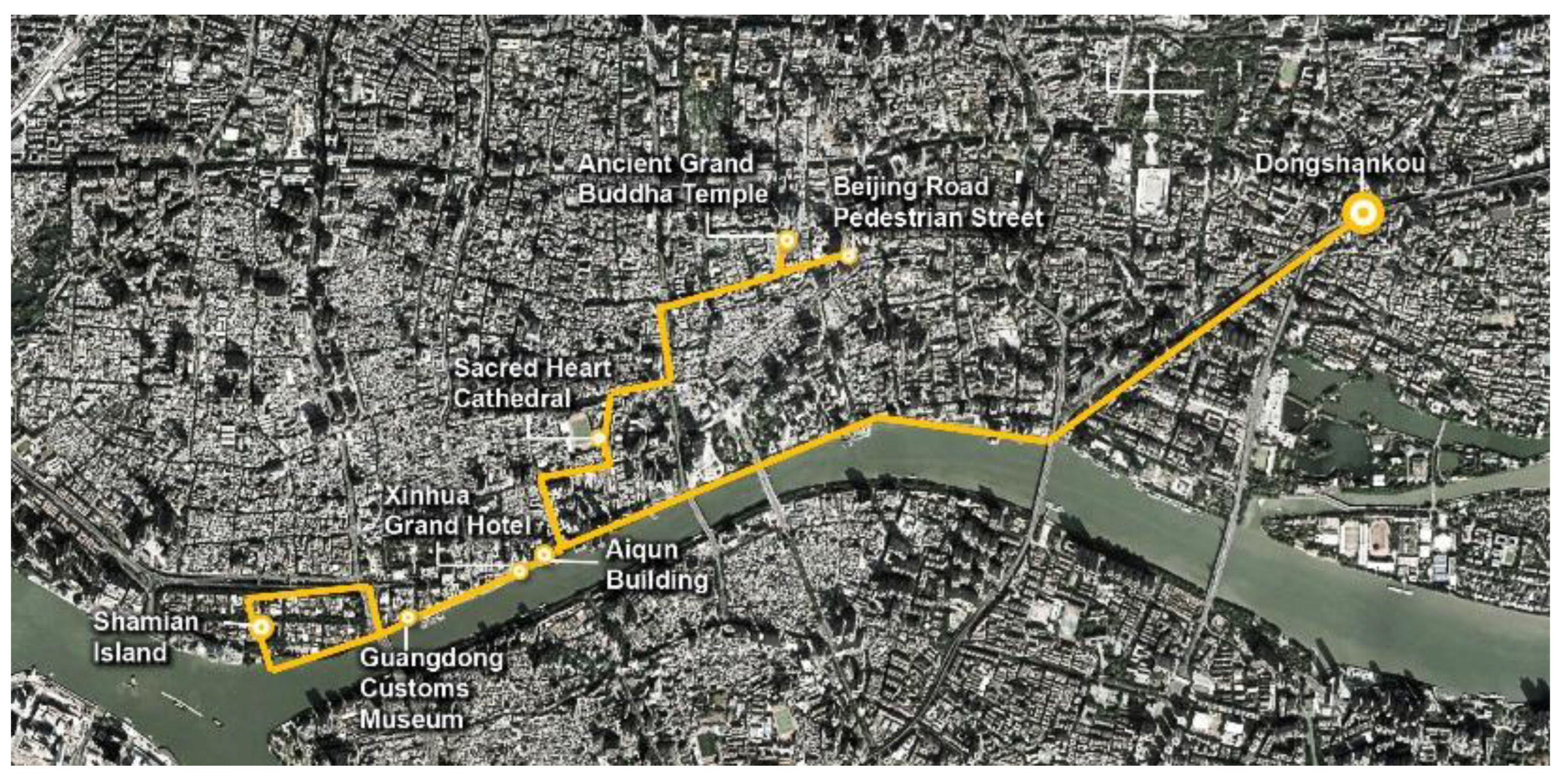 | Route 8 | Binjiang West Road → Renmin Bridge → Former Site of Guangdong Customs → Post Museum → Nanfang Building → Xinhua Grand Hotel → Aiqun Building | Riverside heritage, treaty port history | |