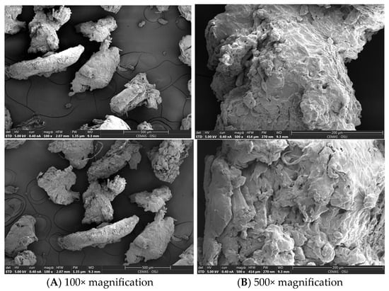 Figure 1 shows the pulverized plastic waste utilized in the study. The plastic waste had a dark color, water absorption of 0.1%, average particle size of 0.3 mm, and specific gravity of 0.95. Scanning electron microscopy images of the plastic waste are presented in Figure 2. The plastic waste particles are irregular in shape (see images on Figure 2A). The width of the plastic samples shown in the images in Figure 2B are approximately 400 μm or 0.4 mm and have a rough texture and spongy structure.