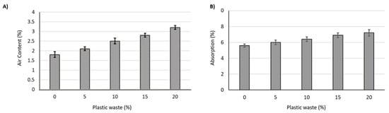 (A) Influence of plastic waste on the air content of PCC. (B) Influence of plastic waste on the water absorption of PCC.