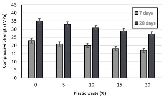 The compressive strength of PCC is considered one of the most vital properties and is related to other critical properties such as permeability, durability, abrasion resistance, shrinkage, creep, and bond with reinforcement, etc. The effect of plastic waste on the compressive strength of PCC after 7 and 28 days of moist curing is illustrated in Figure 5. The compressive strength decreased with the increase in plastic waste contents from 23 and 35 MPa for P0 mixture without plastic waste at 7 and 28 days, respectively, to 17 and 27 MPa for P20 mixture with 20% plastic waste level. The maximum percentage decrease in compressive strength of PCC after 7 and 28 days were 26% and 23%, respectively. The strength reduction was 11% (from 35 MPa to 31 MPa) at 28 days when 10% plastic was added to concrete. This high compressive strength reduction can be tolerable in many structural design applications given the environmental benefits of using plastics in concrete, as discussed above.
