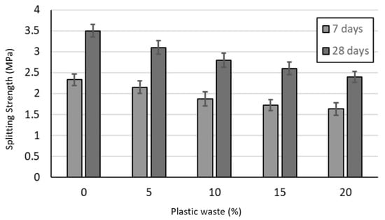 Figure 6 shows that the splitting strength of PCC at the age of 7 and 28 days decreased with increasing plastic waste content. The splitting strength (after 7 and 28 days) of moist curing decreased (from 2.33 and 3.5 MPa) for the P0 reference mixture (to 1.63 and 2.4 MPa) for the P20 mixture. Therefore, the maximum percent decrease in the splitting strength at the age of 7 and 28 days was 30% and 31%, respectively, for the P20 mixture. The percentage decrease in the splitting strength of PCC containing plastic waste after 7 and 28 days of moist curing was higher than the percent decrease in the compressive strength. This behavior may be explained by the increase in air content and voids of PCC with the increase in plastic waste. The air voids present in the PCC with plastic waste facilitate splitting strength failure more than compressive strength failure. It should also be noted that the plastic size used in this research was small.
