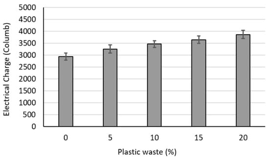 The penetration of chloride ions into PCC is the main cause of the corrosion of reinforced steel in reinforced concrete elements. The corrosion process of steel is a very slow process and may take more than ten years in the field. The rapid chloride permeability test gives an indication of the susceptibility of chloride ions to penetrate PCC, and hence the corrosion susceptibility of the PCC. Figure 7 shows the electrical charge (in Coulomb) of the rapid chloride permeability test. The electrical charge passed through the PCC specimens increased with the increase in plastic waste content, which indicates higher chloride penetration and more corrosion susceptibility. The electrical charge was increased from 2940 Columb for the reference PCC without plastic waste (P0) to 3870 Coulomb for the P20 mixture that contains 20% plastic waste. The maximum percentage increase in the electrical charge was 24% for the PCC with 20% plastic waste content. This indicates that plastic waste concrete is more susceptible to chloride penetration and corrosion. The higher permeability of concrete with more plastic materials can be explained by the increase in the water absorption and air content of the PCC with plastic waste, as discussed in Section 3.1. The increase in the water absorption of the plastic waste PCC (Figure 4B) causes an increase in the chloride ions penetrating into the PCC.