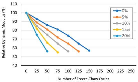 Freeze–thaw deterioration of PCC is common in regions with cold weather, particularly where temperatures drop below −12 °C. The freezing of the capillary water inside the PCC pores exerts internal pressure and tensile stresses on the cement paste matrix of the PCC, causing deterioration of the PCC that progressively increases with repeated cycles of freezing and thawing. The main approach to reduce the freeze–thaw deterioration in the PCC is to introduce air-entrained bubbles inside the cement paste matrix that reduces the pressure resulting from freezing of the capillary water. Figure 8 shows the variations in the relative dynamic modulus of elasticity (calculated from Equation (1)) with the number of freeze–thaw cycles for the PCC containing plastic waste. The relative dynamic modulus decreased significantly for all PCC mixtures investigated as the number of freeze–thaw cycles increased, demonstrating the deterioration caused by freeze–thaw in PCC containing plastic waste.
