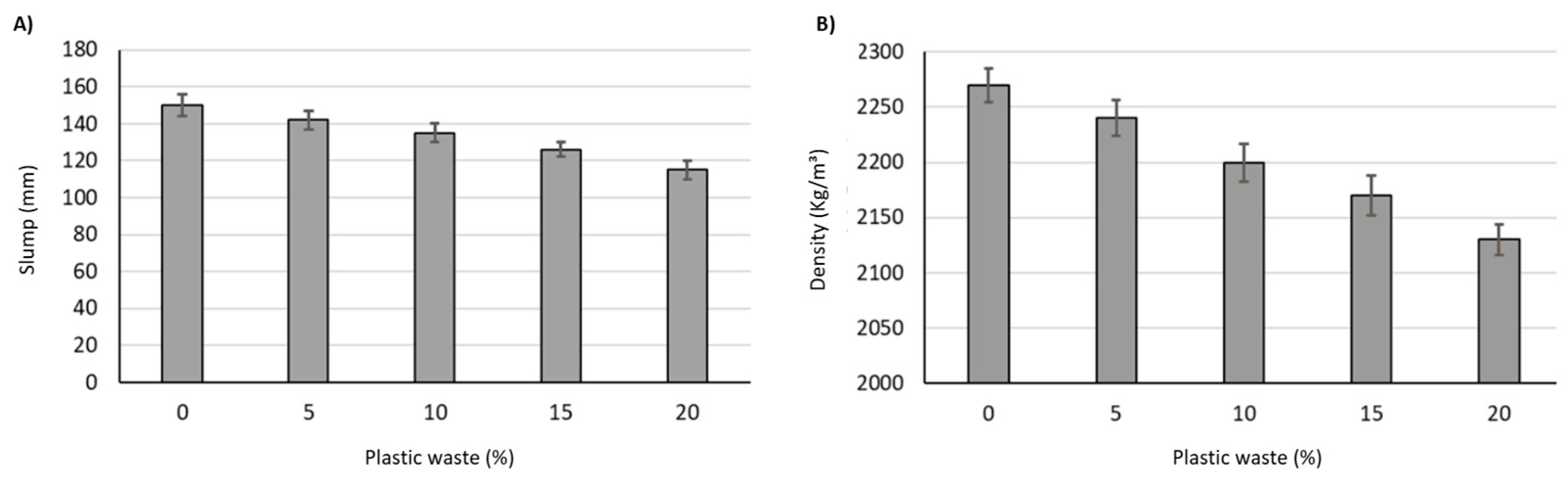 - The density of PCC with plastic waste decreased with the increase in plastic waste level. The maximum decrease in density was 6.2% for the mixture with 20% plastic waste content.