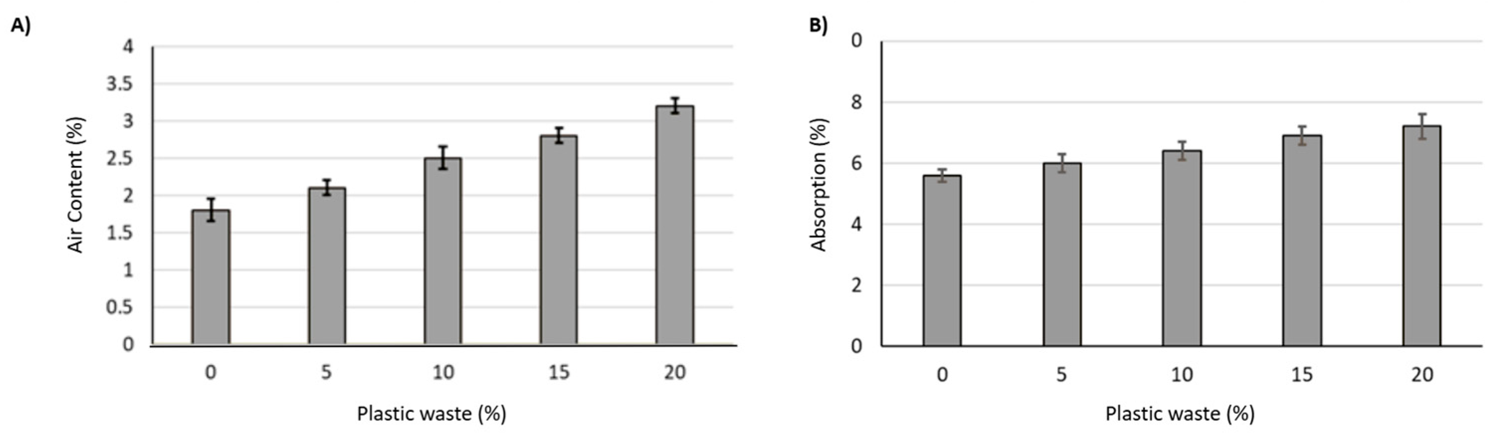 - The air content of PCC with plastic waste increased with increasing plastic waste amounts. The air content increased by 39% and 78% for the mixtures with 10% and 20% plastic waste content, respectively.