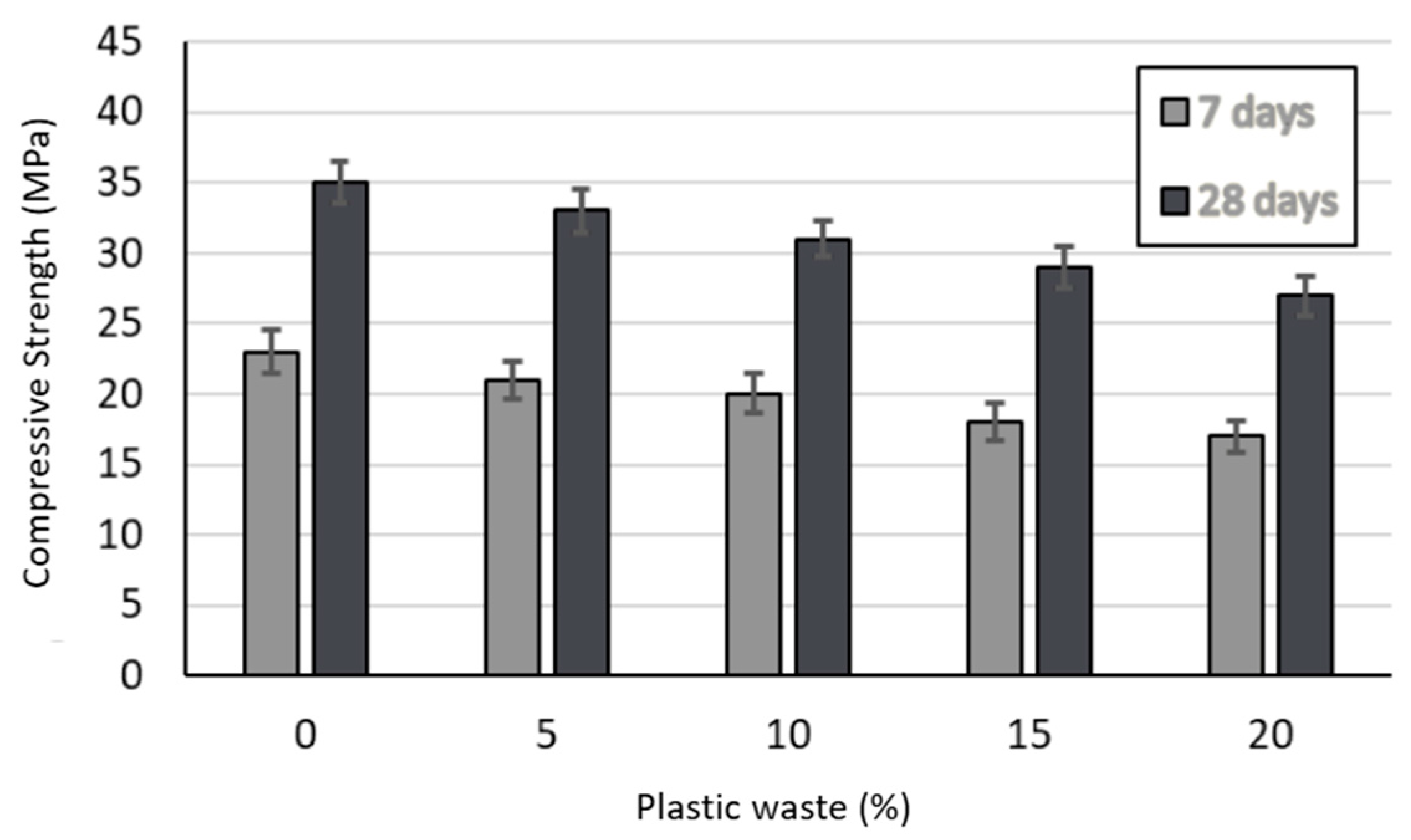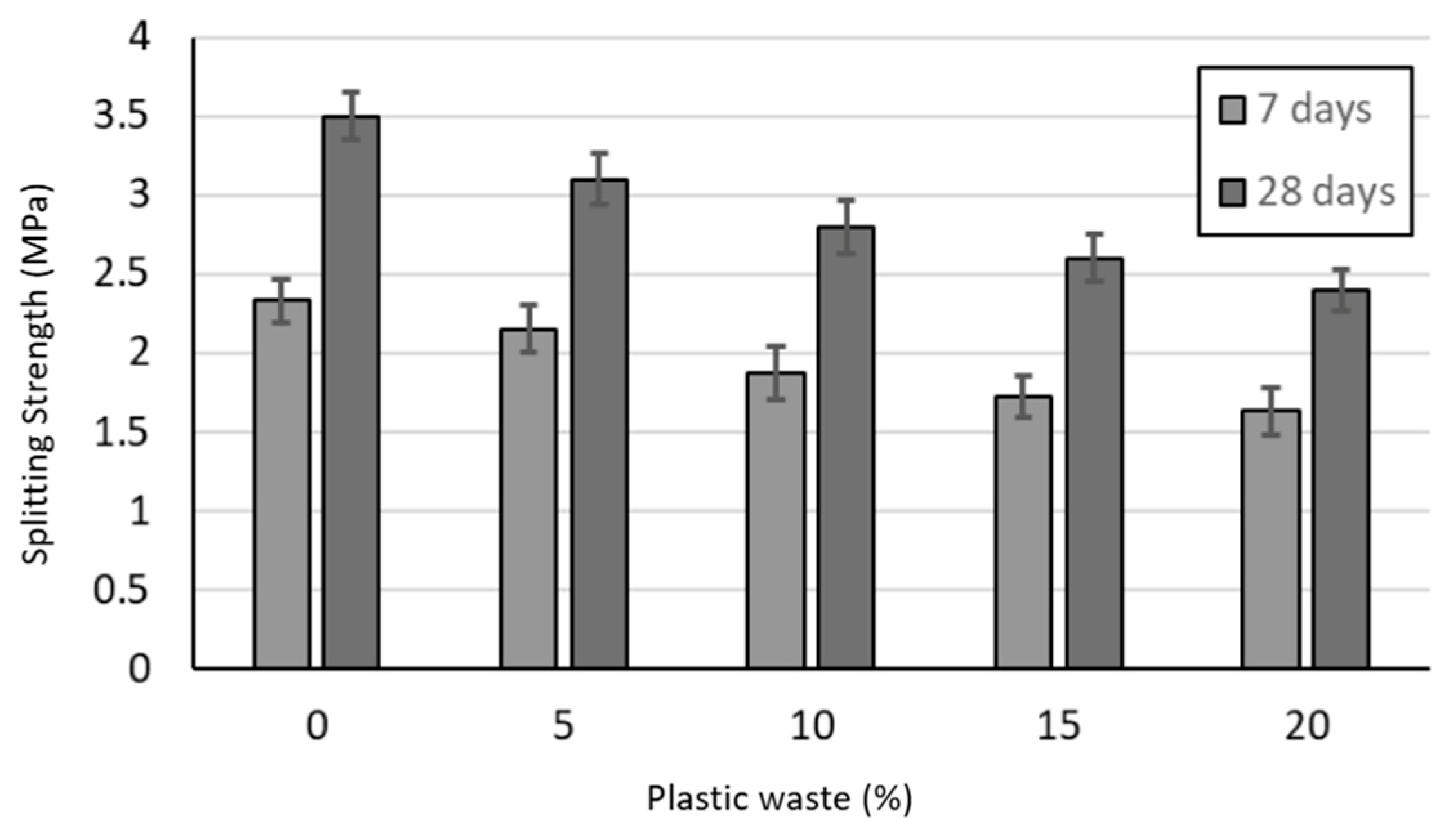 - The mechanical properties (compressive and splitting strength) decreased with the increase in the plastic waste substitution level. The decrease in the compressive strength after 7 and 28 days of moist curing were 26% and 23%, respectively, for the mixture with 20% plastic replacement. Moreover, the maximum decrease in the splitting strength after 7 and 28 days of moist curing were 30% and 31%, respectively, for the same mixture. The compressive strength reduction was only 11% when the PCC included 10% plastic waste, indicating that an addition of 10% plastic waste in concrete can be practical.