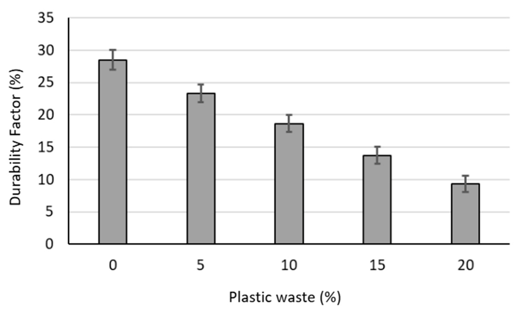 - The durability of PCC under freeze–thaw cycles decreased as the plastic waste content increased. The durability factor decreased from 29% for the control mixture without plastic waste to 9% for the mixture with a 20% plastic waste level.