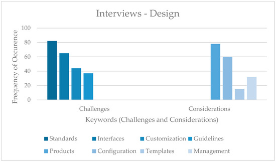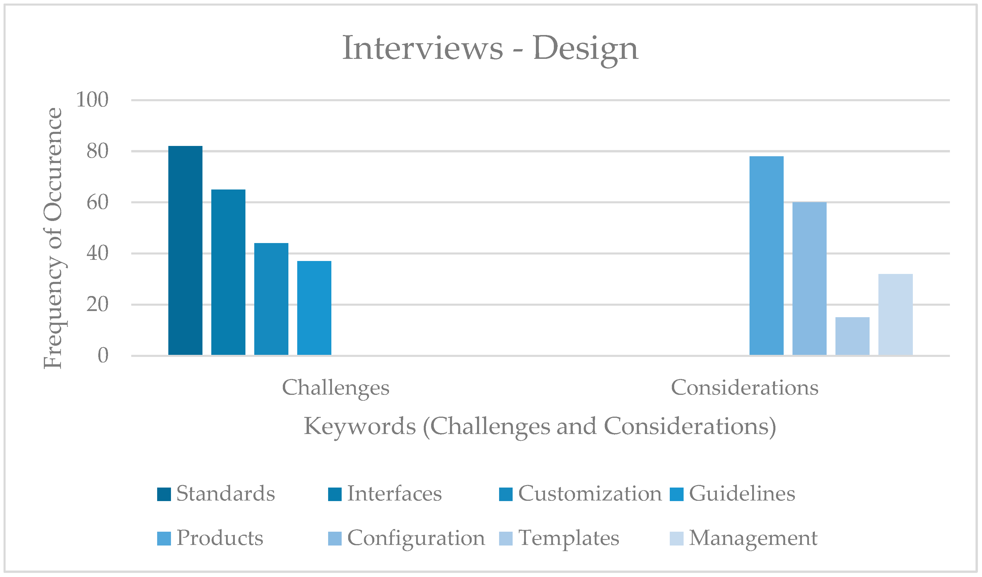 Figure 2 illustrates the most frequently repeated keywords related to the challenges and considerations of this factor. The participants identified insufficient design standards and interfaces as the main barriers. Design professionals emphasized the lack of customization and predefined design guidelines. The considerations’ results show that productization and configuration were the primary focus of all interviewees. Design management and design templates create feedback loops between design and delivery. These mechanisms ensure that design outputs remain manufacturable, repeatable, and scalable.