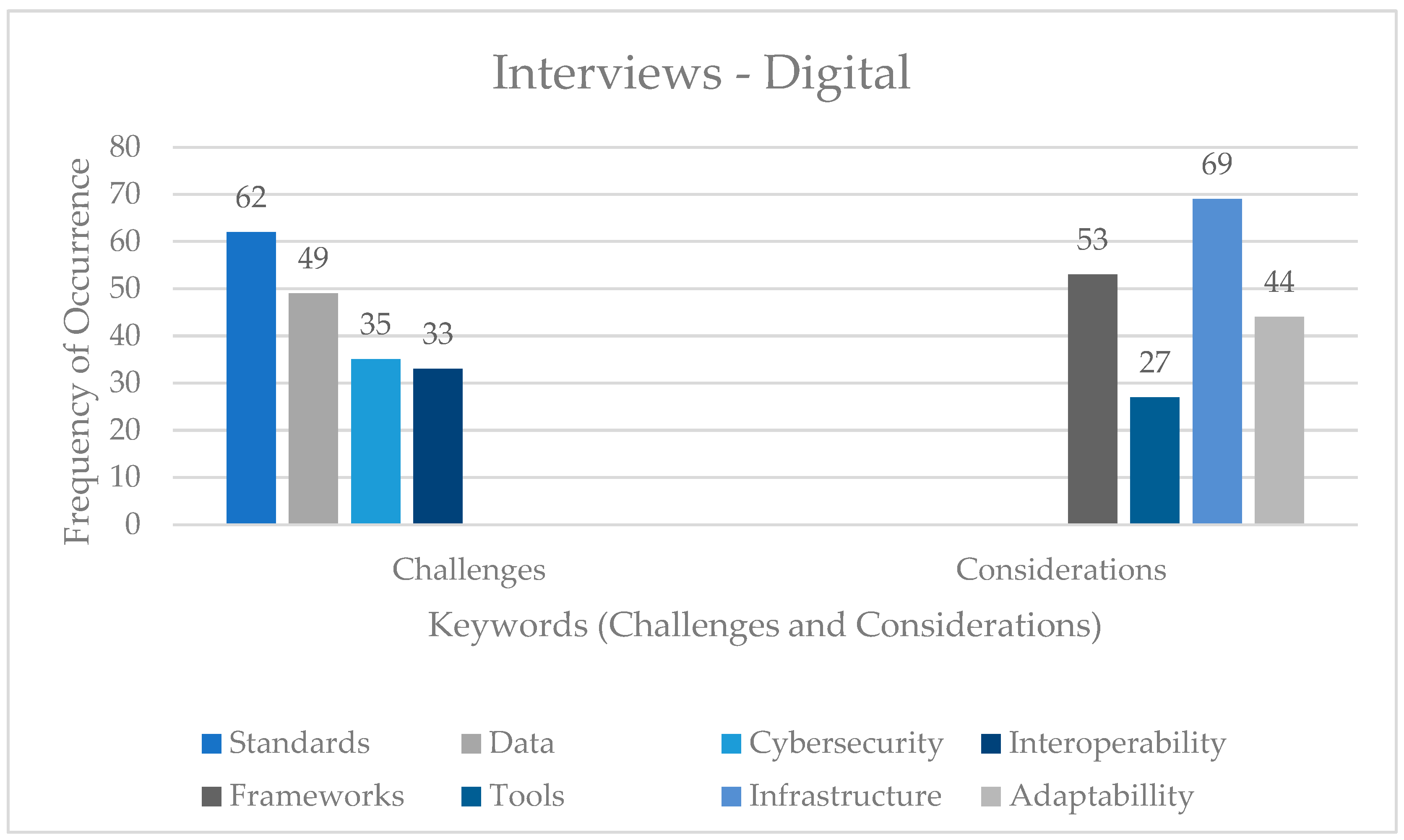 To establish a systematic link between empirical findings and the TOE framework, each theme emerging from the interviews and policy analysis was categorized according to its dominant contextual dimension: technological, organizational, or environmental [16]. The technology dimension encompasses themes related to digital interoperability, standardization tools, and automation barriers, the organizational dimension relates to leadership readiness, inter-departmental collaboration, and resource allocation, and the environmental dimension concerns policy support, client demand, and supply chain maturity [16]. This mapping process was conducted manually through thematic analysis, following the identification of key themes from the interviews and policy document analysis. Each theme was reviewed and categorized according to its dominant contextual relevance within the TOE framework. This mapping followed a theory-driven thematic logic [46,47] in which the TOE framework served as an analytical lens for organizing and interpreting the data. Cross-checking between interview and policy results ensured consistency and reinforced the analytical validity of the categorization.