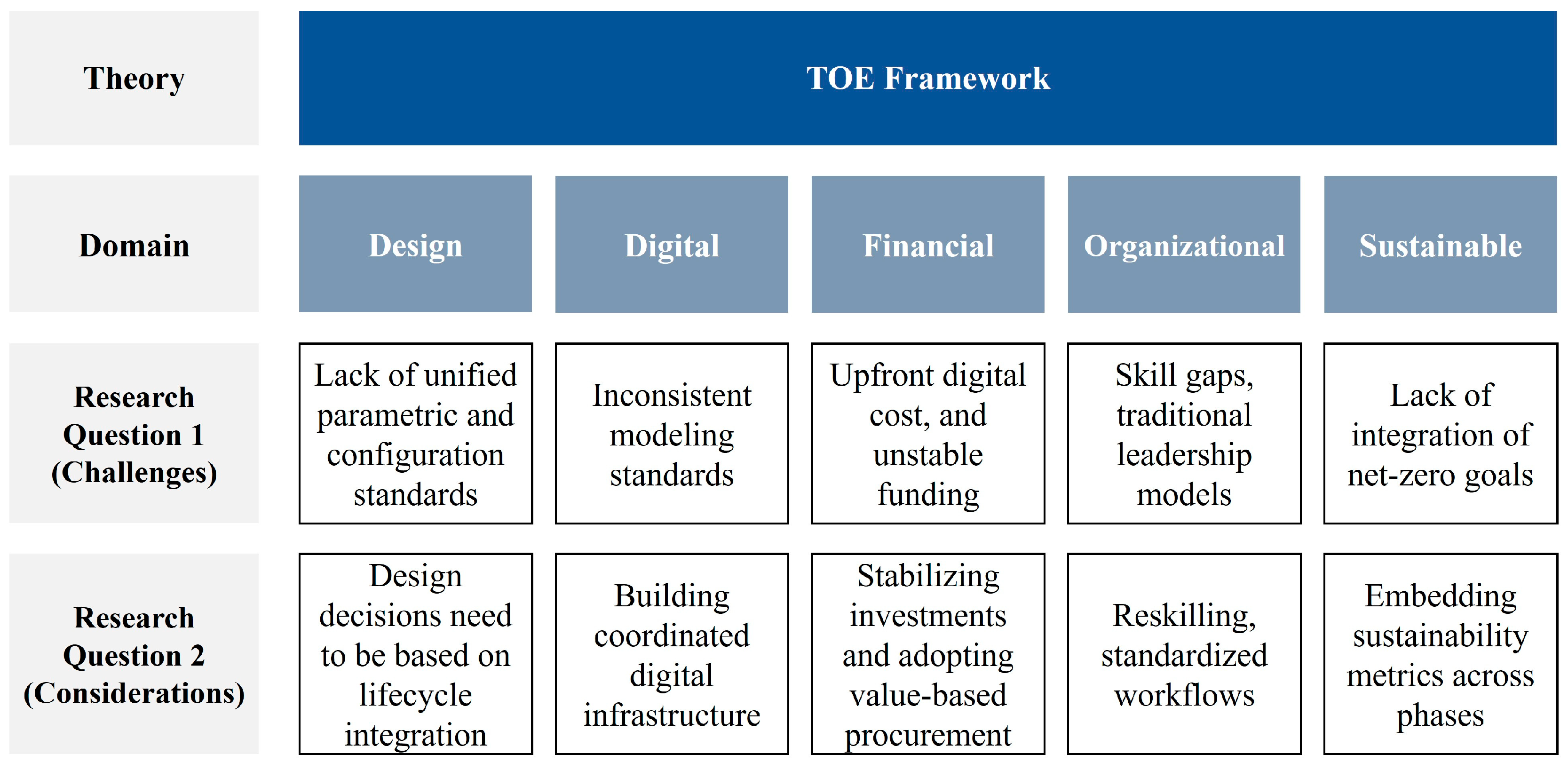 It is necessary to address these gaps to advance the industry’s theoretical understanding and practical implementation of P-DfMA. A clear picture of how design professionals interpret and adapt P-DfMA principles would inform policy directions and organizational strategies that support innovation. Therefore, this study sought to bridge the divide between theory and practice by integrating practitioner insights and policy analysis within a unified TOE framework.