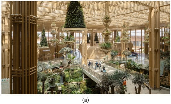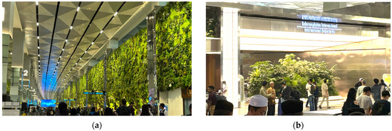 Airports that adopt nature in new builds (Figure 1)—integrating biophilic elements such as natural light, water features, and natural materials—are motivated by different reasons. Historically, gardens and plants have been used to signal national identity [25], such as Singapore’s garden-city identity reflected in Changi Airport, or Bengaluru’s Kempegowda International Airport’s snapshot of the country’s landscape. With others following suit and seeing success, natural aspects became a dimension of marketing and advertising as pictures of the green features flooded social media [26,27,28]. Furthermore, greenery became a commercial source of revenue, as increased dwell time [27] meant an increase in spending. Finally, in an era of prioritising sustainability efforts, planting serves as a visual representation of the airports’ environmental consciousness [28].