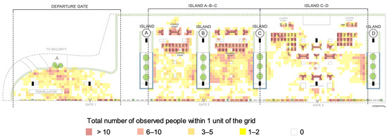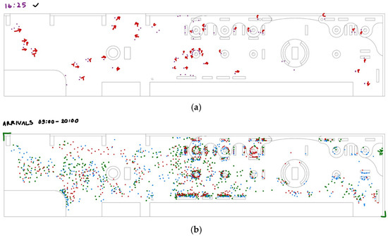 Large zones, such as the check-in hall, were divided into three subzones: between islands A and B, between islands C and D, and the departure gate, with observations made every hour. Activities within these subzones were recorded by walking through the area, whereas the ground-floor arrival hall was monitored from above, using a vantage point on the second floor. Passenger location was plotted as dots [48] and activities coded with alphanumeric symbols (activity codes in Table A1, sample of observation in Figure 4).