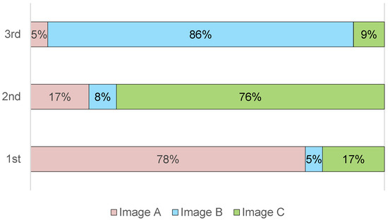 Preference and attitude items indicate that passengers generally favour plants. For image ranking (C1) (Figure 5), 78% of respondents chose the lushly planted Image A as their most-preferred terminal scene, 76% placed the moderately planted Image C second and 86% ranked the sparsely planted Image B last. A goodness-of-fit test confirmed these differences were significant (χ2_GOF = 309.46, p < 0.01, Cramer’s V = 0.71, n = 103).