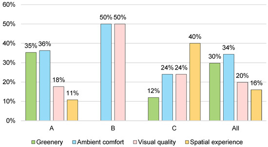 Open-ended responses for C2 revealed themes (n = 100, with 129 total mentions), of which ambient comfort (34%) was the most frequently cited factor, followed by greenery (30%), visual qualities, and spatial experience (see Figure 6). Among those selecting Image A (n = 78), ambient comfort (36%) and greenery (35%) were the top reasons. The small group favouring Image B (n = 5) mentioned relaxation, visual quality, and order. Conversely, nearly half of the supporters of Image C (n = 17) preferred its spaciousness and organisation, with additional comments about signage and familiarity. A few participants voiced concerns about the maintenance costs of airport greenery and the potential effect on airfare. Full responses to the open-ended questions and their themes are provided in the Supplementary Materials.