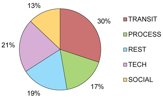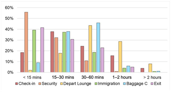 For B1, Table 4 depicts that the median for dwell time is shortest in security and immigration (less than 15 min), and the longest in the departure lounge (30–60 min). In terms of distribution (Figure 8), most respondents spent less than 15 min in security (58%), immigration (39%), and exit/arrival hall (42%), 15–30 min at check-in (38%), and 30–60 min in the departure lounge (44%), and baggage claim (46%). However, 37% of respondents also spent 30–60 min in baggage claim.