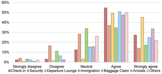 Figure 9 shows the distribution of answers to question D4, indicating an apparent difference between “Agree” and all other answers, with check-in, baggage claim, and exit/arrivals each passing or approaching 50%. “Strongly agree” is the highest response at just above 40%.