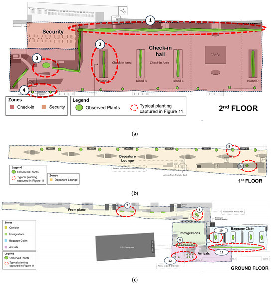 A rapid plant audit was conducted on the first and last days of fieldwork, covering the landside zones (immigration and baggage claim) and the airside zones (security and departure lounge) in sequence. Similar audits in airport settings have been reported, using web-sourced images to map closed green spaces [49], and general observations of airport zones with photo logs [50]. While not a common practice, as airport-based studies often rely solely on participants’ testimonies [35], this approach sets a precedent for documenting visible green features in terminals.