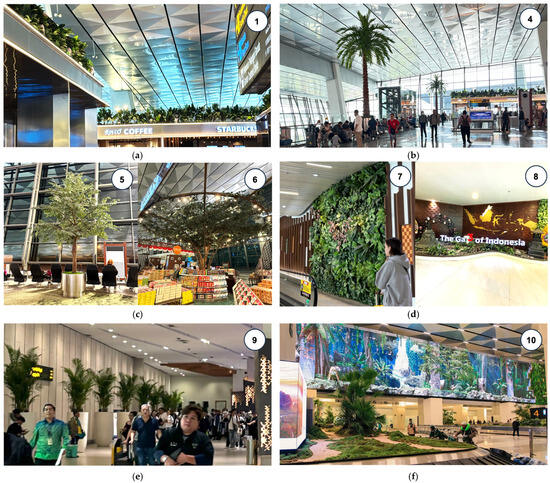 Opened in 2016, Terminal 3 expands Soekarno–Hatta’s capacity and features a contemporary aesthetic distinct from the vernacular design of Terminals 1 and 2 [41]. This expansion responds to the increasing demand for air travel, which remains the most efficient mode of transportation across the archipelago [42]. Greenery was added during InJourney’s 2024–2025 ‘green-beautification’ refurbishments [43] (Figure 2), making the terminal suitable for studying whether the current indoor plant installation contributes to passengers’ wellbeing.