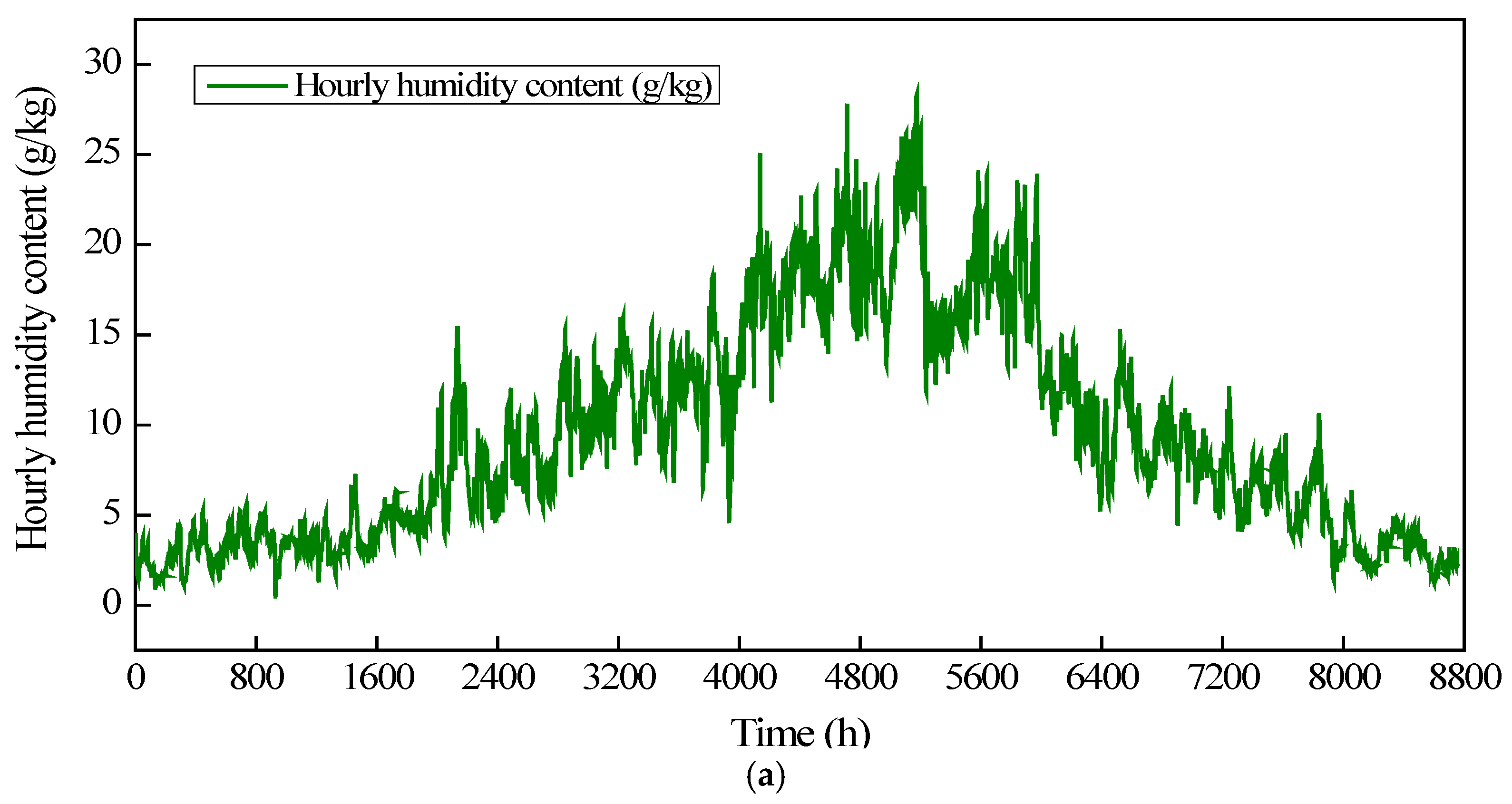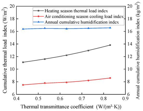 Figure 8, as the thermal transmittance coefficients of the exterior walls and windows decreased, the building’s insulation performance improved significantly, reducing the seasonal heating and cooling loads. The reduction in heating load during the heating season was especially significant, while cumulative annual humidification remained relatively stable.