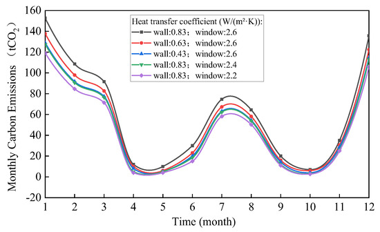 Figure 10 illustrates the estimated carbon emissions simulated based on varying thermal transmittance coefficient assumptions for the building envelope. These results demonstrate that modifications to the envelope thermal transmittance coefficient can lead to noticeable changes in annual carbon emissions. A reduction in the exterior wall thermal transmittance coefficient, from 0.83 W/(m