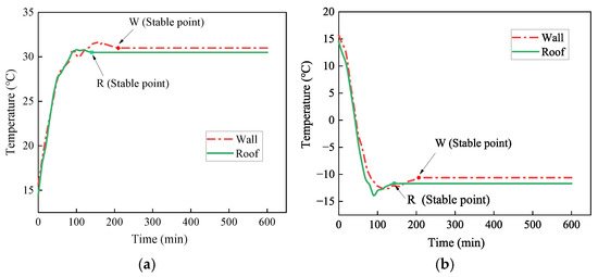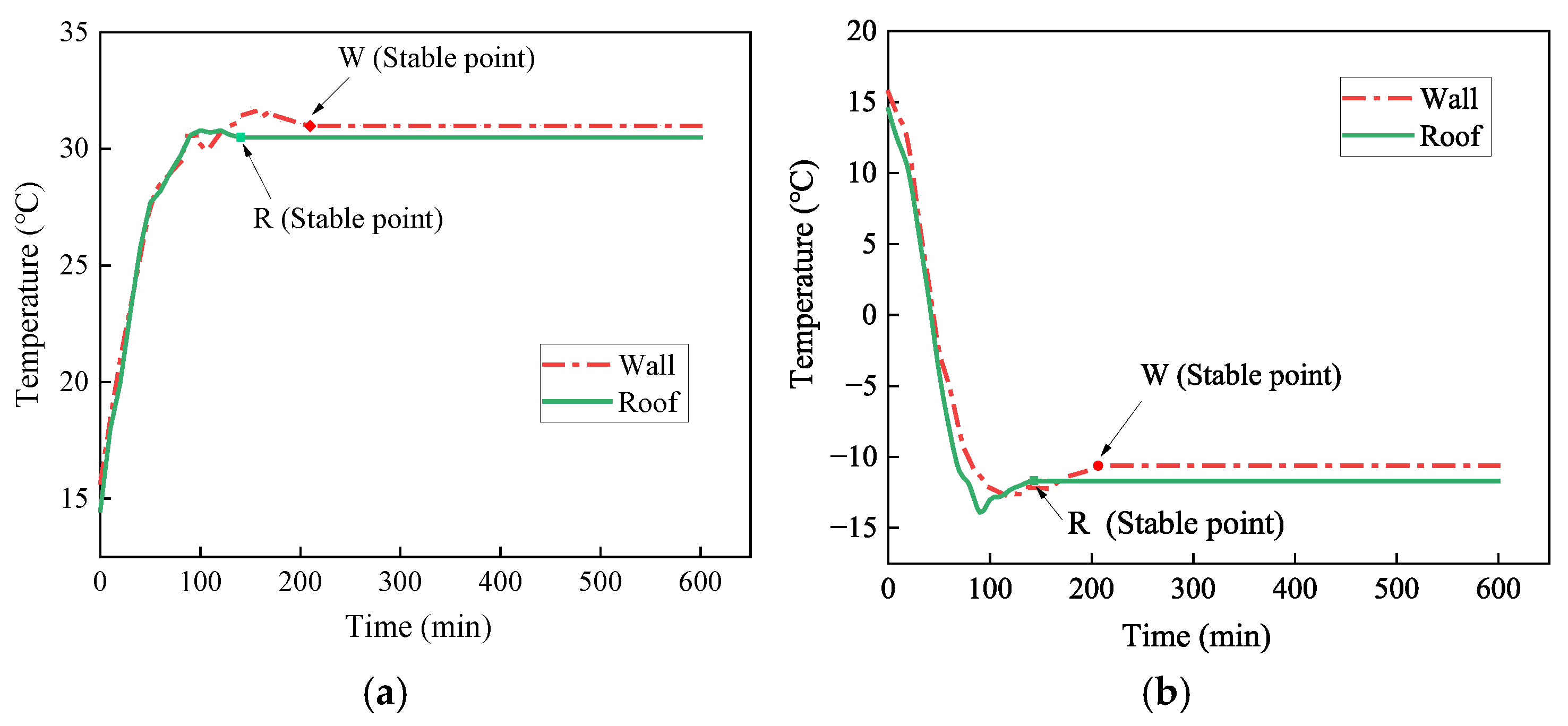 Figure 13 depicts the variation over time of the temperatures of the hot and cold boxes during the exterior wall and roof experiments, with ‘R’ and ‘W’ denoting the points at which the roof and exterior wall, respectively, reached thermal stability. The recorded stabilization times for the hot box were 153.81 min for the roof sample and 202.5 min for the in situ exterior wall sample; for the cold box these were 149.12 min and 207.62 min, respectively. These results indicate that the roof structure sample exhibited superior thermal stability to the wall sample during testing. The final measured thermal transmittance coefficients were summarized in
