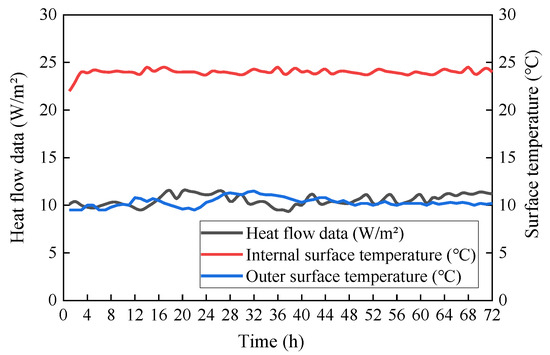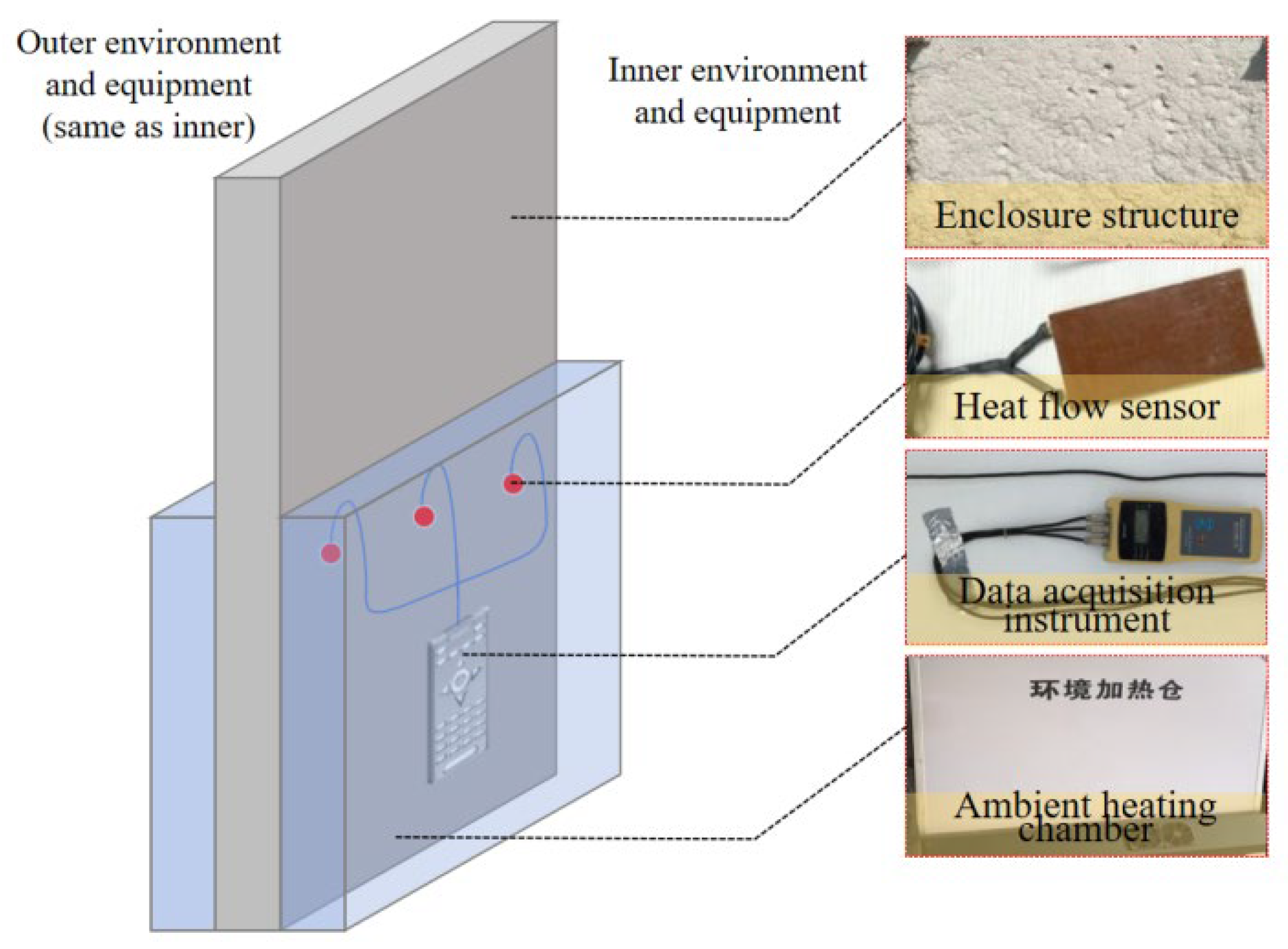 In situ measurements of the exterior surface temperature and heat flux density of the wall were also conducted using the SK-FHRL1810W thermal performance detector, whose experimental principle is illustrated in