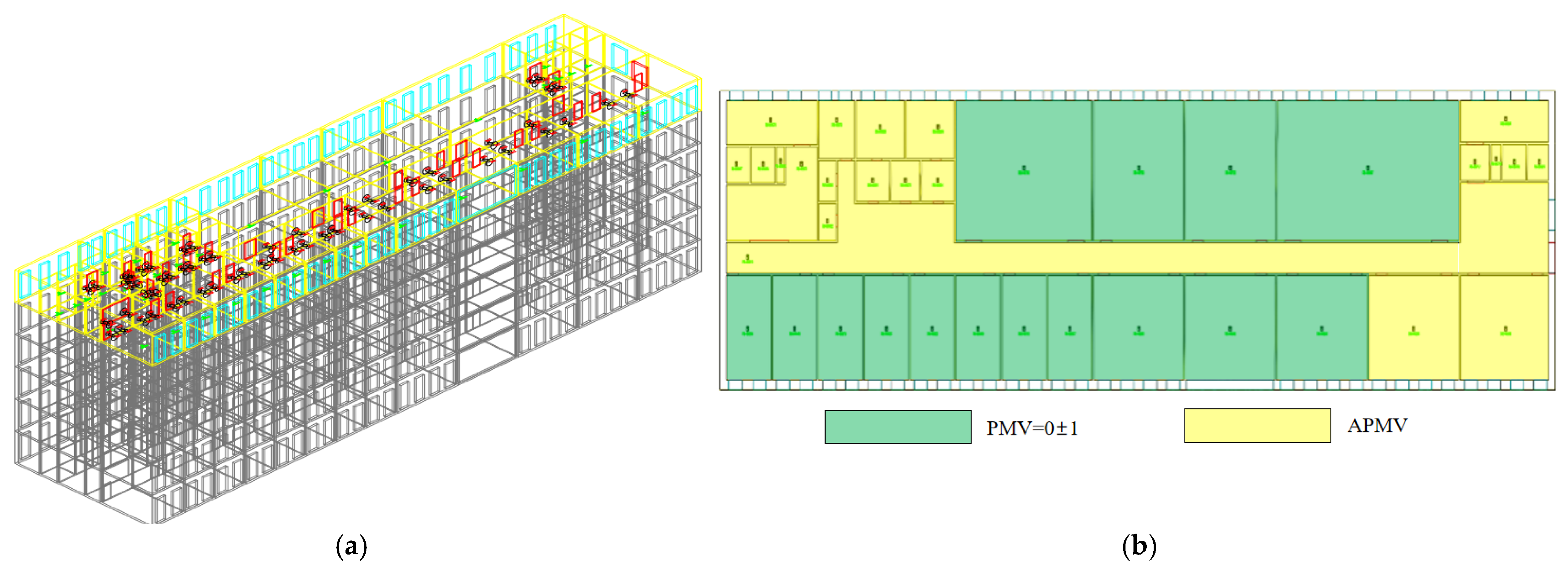 Based on the analysis of the above model, in order to ensure the comfort and satisfaction of office workers while guaranteeing the low-energy operation and maintenance of the building, the warehouse, machine room, restrooms, and public areas were set according to the APMV standard, while the main office areas adopted a more relaxed PMV mode. Subsequent research on the building’s thermal load and carbon emissions will be based on this model.
