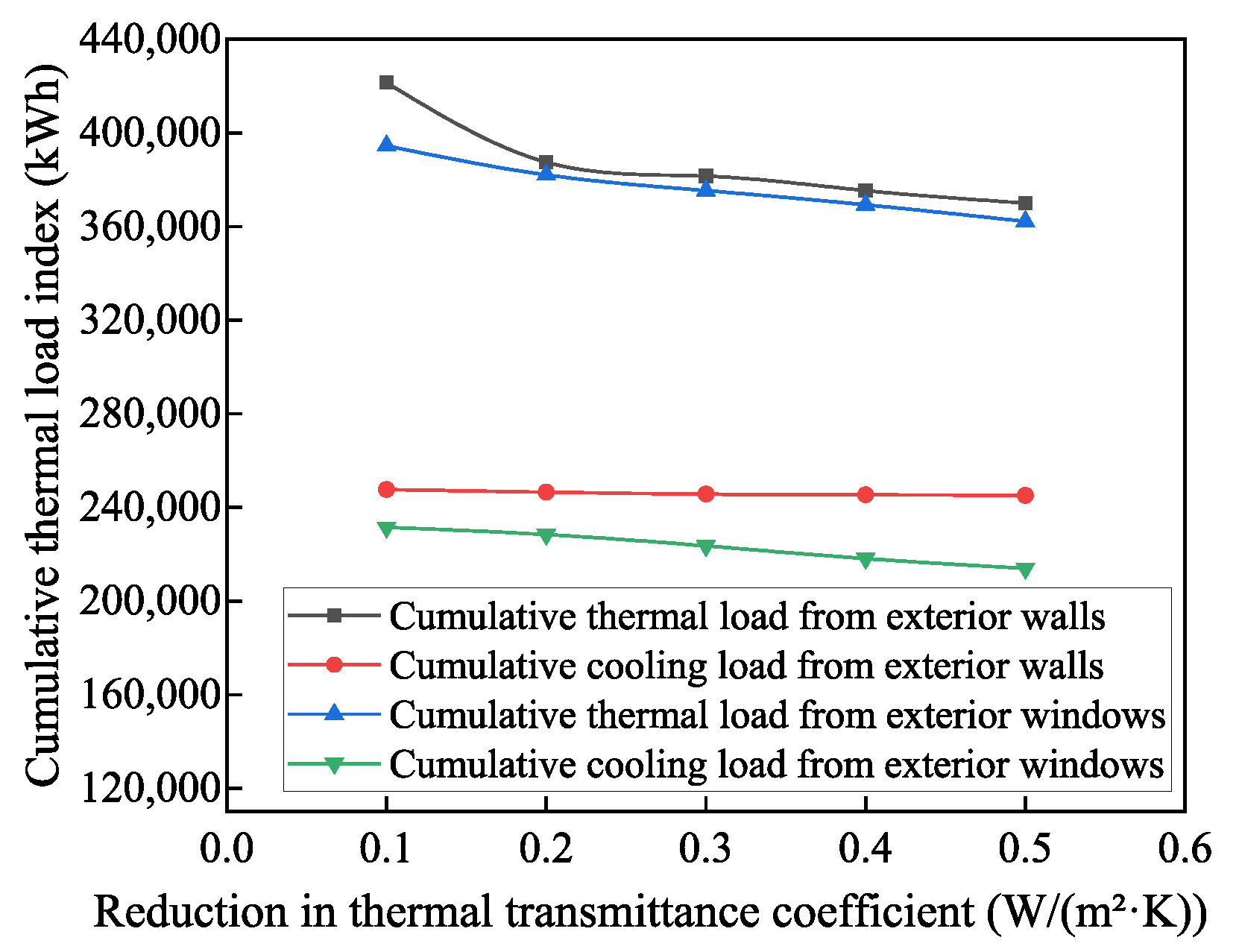 2K), the cumulative heating load decreased from 100% to 91.9%, 90.5%, 89.1% and 87.8%. Meanwhile, the cumulative cooling load decreased from 100% to 99.5%, 99.2%, 99.0% and 98.9%. These results indicate that a reduction in the thermal transmittance coefficient of the exterior wall alone can lead to a significant reduction in building heating load. Meanwhile, the impact on the cooling load is comparatively modest.