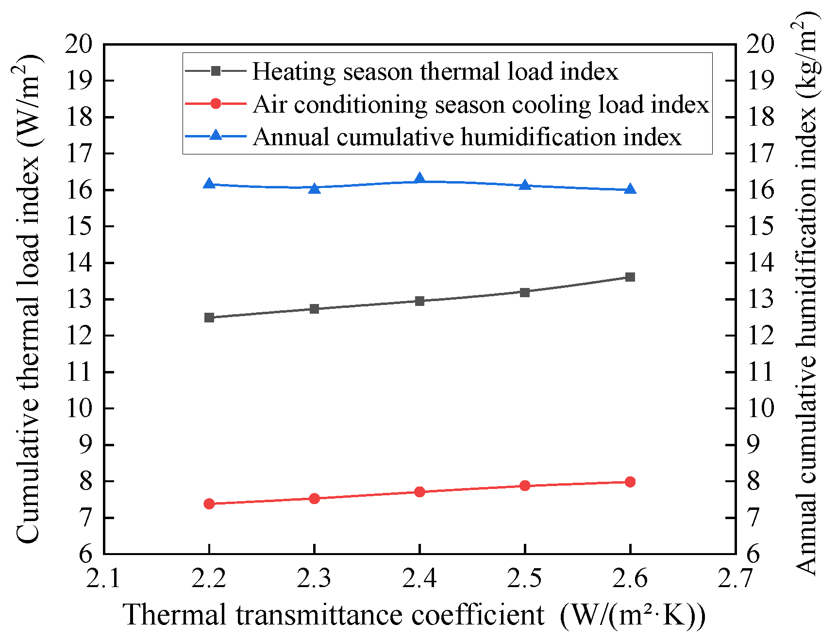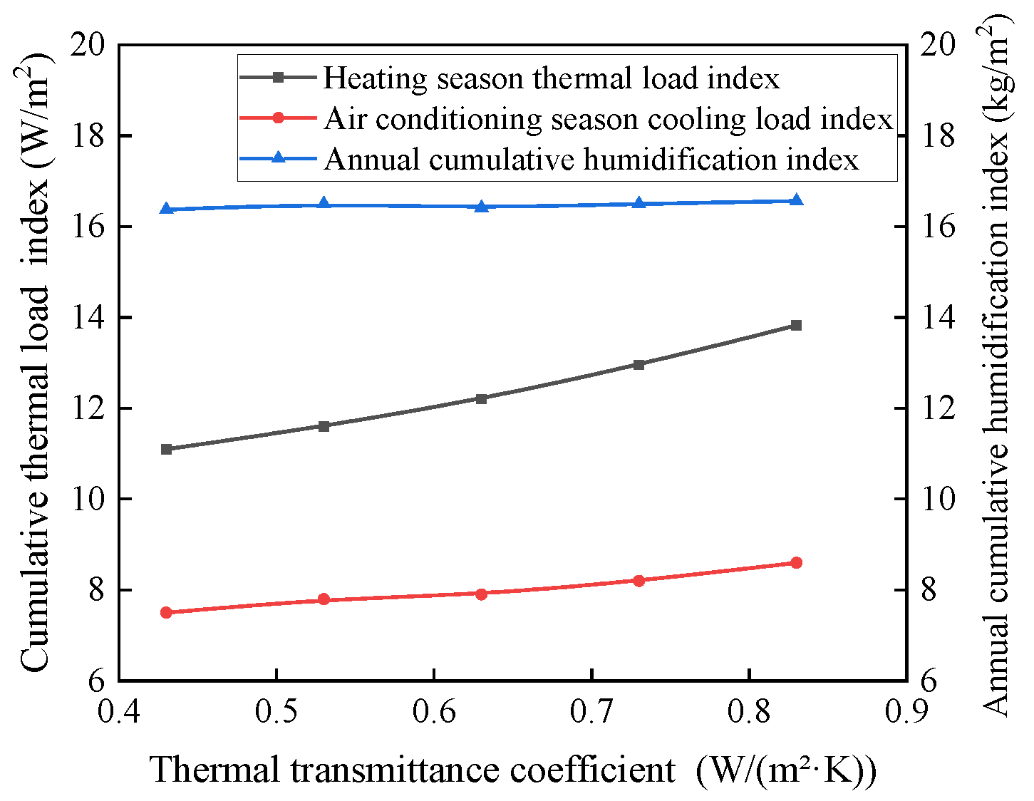 As the thermal transmittance coefficient of buildings’ exterior walls and windows decreases, their insulating performance improves significantly, reducing their seasonal heating and air conditioning loads. The most notable reduction occurs in the heating season. By contrast, annual accumulated building humidity load remains relatively stable.