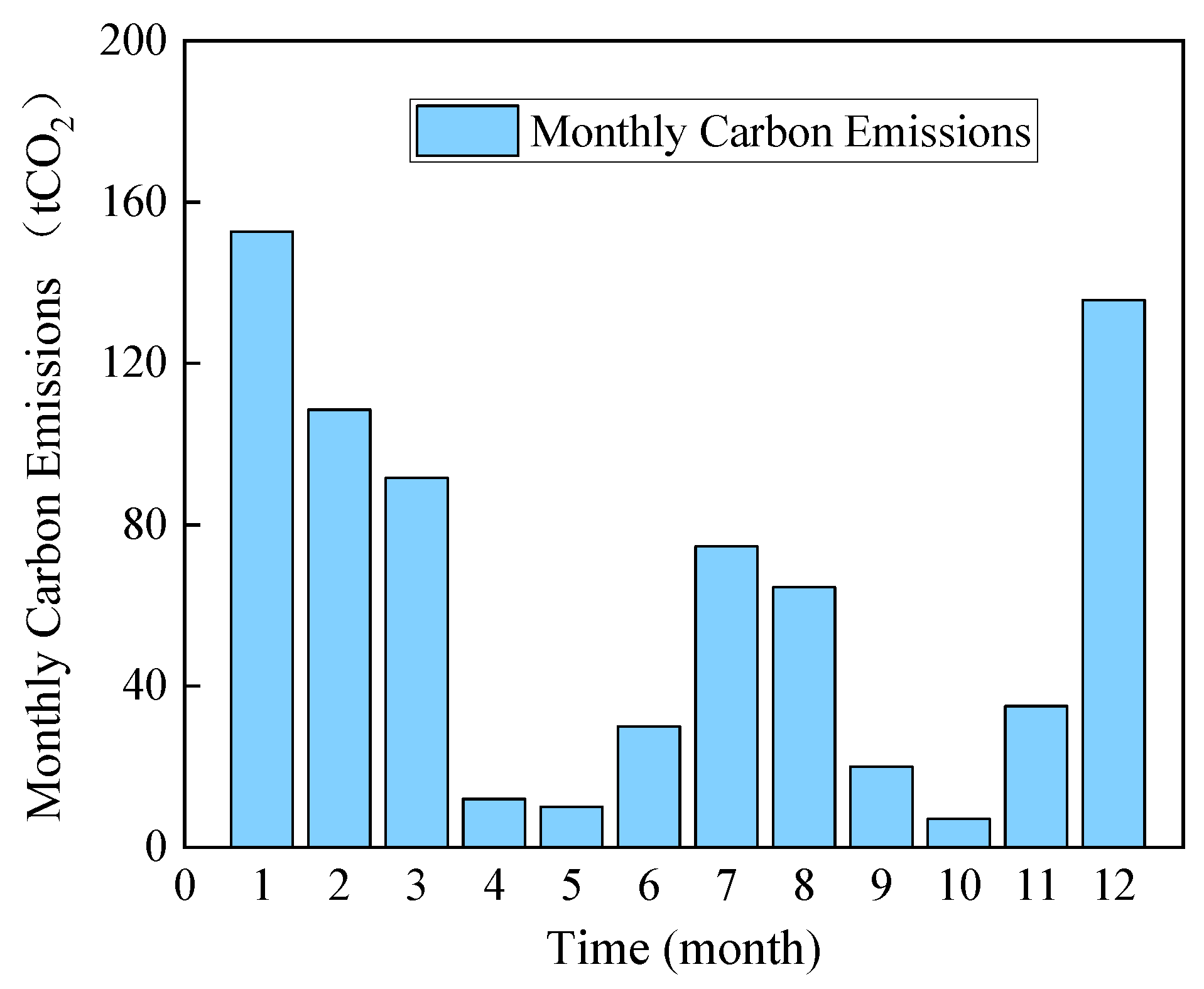 Figure 9 presents the monthly carbon emission calculations for the building. As shown in the figure, the higher thermal loads generated during the heating and cooling seasons result in higher carbon emissions during these times. In addition to energy use for heating and cooling, DeST can also, as required, estimate and calculate energy consumption for other building uses including ventilation, water supply and drainage, lighting, and elevators, all of which contribute significantly to overall carbon emissions of the building. These can then be used in carbon emission calculations based on such modeling. Thus, the DeST software can also provide data useful for low-carbon operations management during building maintenance.