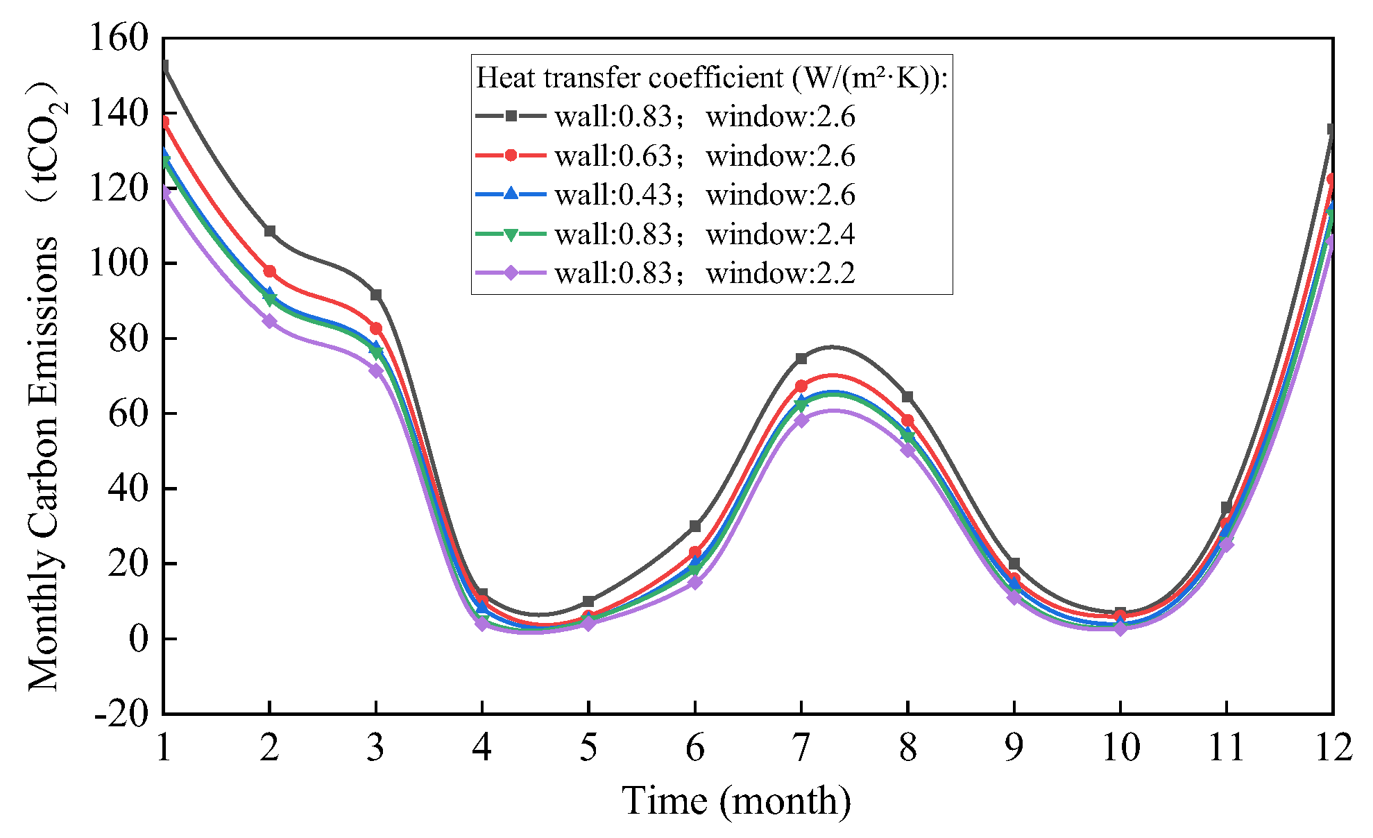 As the thermal transmittance coefficient of a building’s envelope components decreases, its annual carbon emissions are clearly reduced.