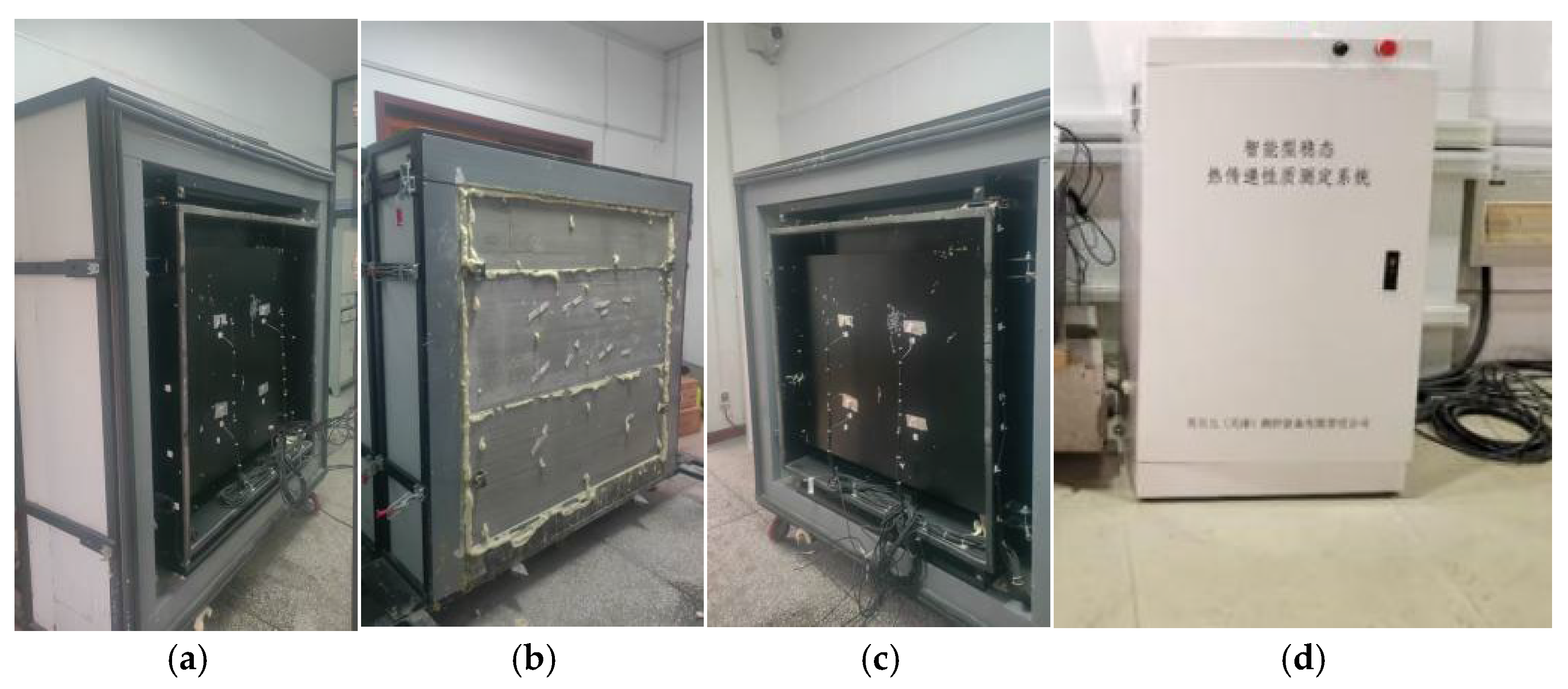 Table 12. During the steady-state heat transfer tests, these were placed between the hot and cold boxes, with the specimen positioned against the side of the hot box. The cold and hot boxes were then fixed in place, using threaded rods to ensure good contact between the specimen and both the hot and cold boxes. The perimeter was subsequently sealed with a colloidal substance to prevent heat loss. After assembly, the setup was left in the test environment for over 48 h, allowing the specimen to reach thermal and humidity equilibrium. Since the hot and cold boxes were equipped with temperature sensors, no external temperature sensors were required. Instead, the sensors were affixed to the surface of the specimen using aluminum foils. Each box had four sensors to monitor the temperature inside the box, while the remaining six sensors were used to measure temperature variations across locations at 40 cm intervals on the specimen surface. Before starting the test, airflow speed should be controlled to remain below 2 m/s. Each experiment included a preheating stage and an equilibrium stage. Once the output power of the system had reached equilibrium, the test data was collected; the specimen heat transfer coefficient was calculated automatically by the system.