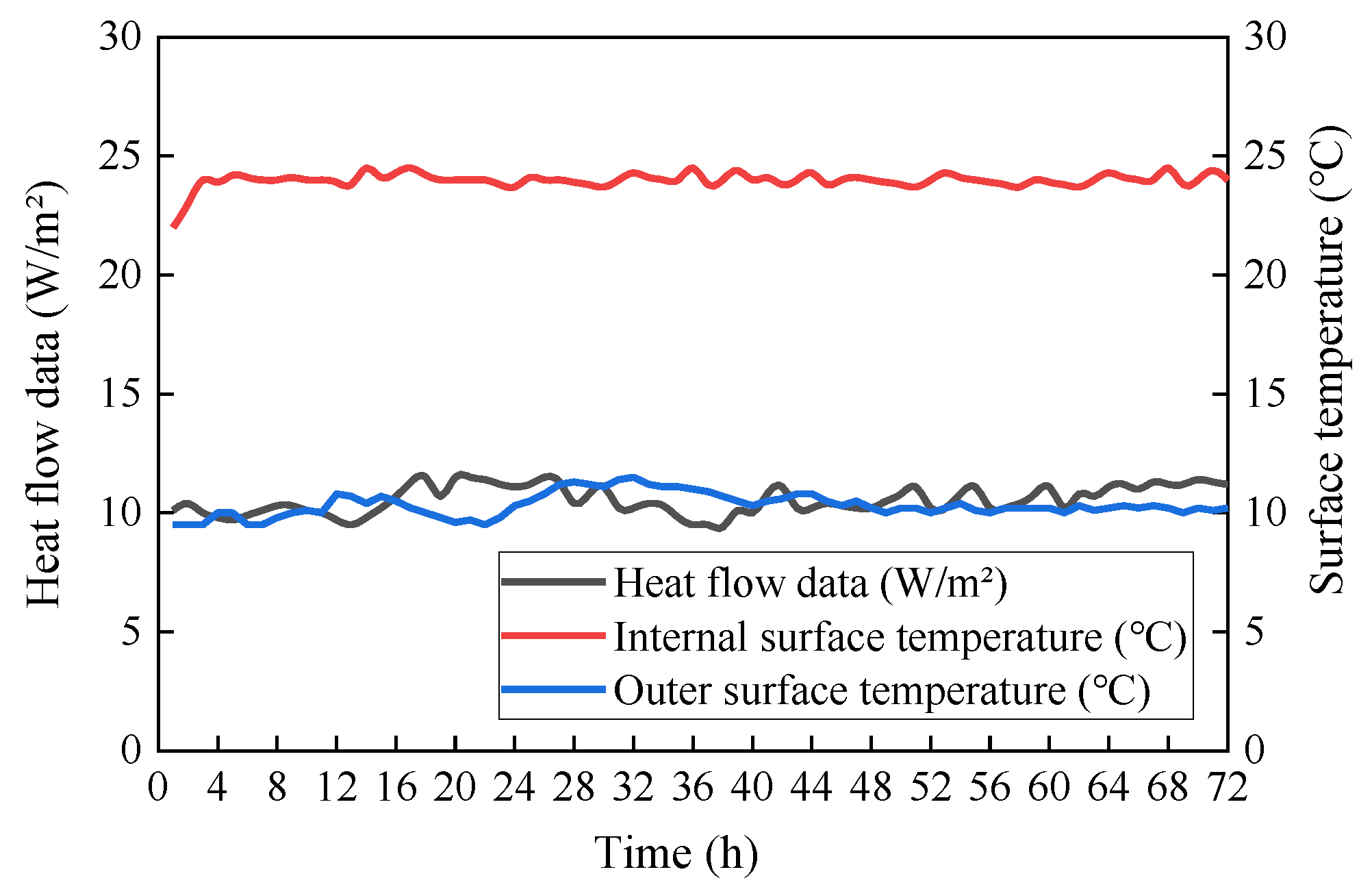 Figure 14. The heat flux sensor was positioned between two parallel plates with a uniform temperature. These guaranteed a one-dimensional steady-state heat flow. Once the temperatures on the interior and exterior wall surfaces reach thermal equilibrium, the detector produces the thermoelectric potential. The thermal resistance and heat transfer coefficient of the in situ sample can then be determined by correlating the heat flux density with the average surface temperature difference, as described in Equation (4).