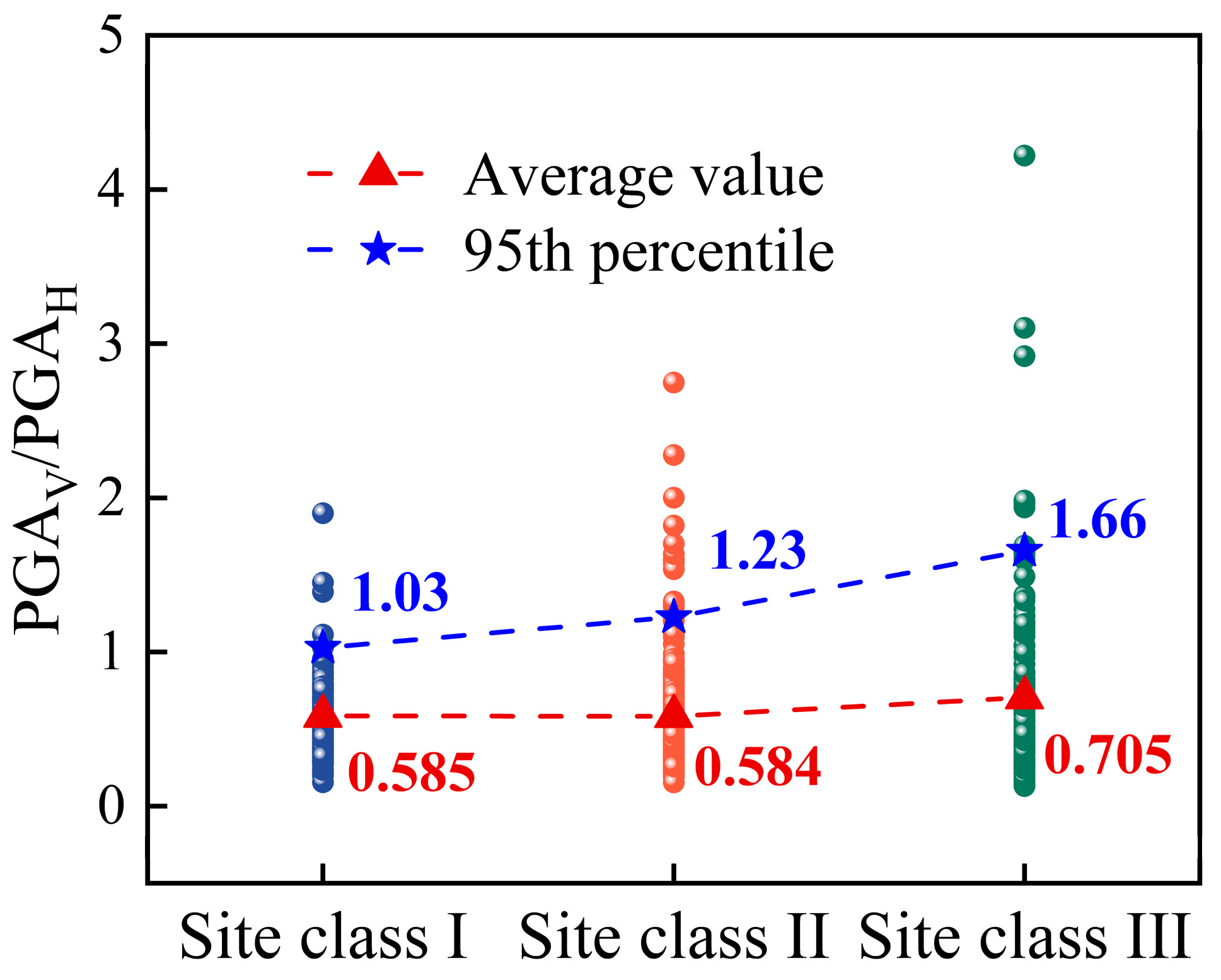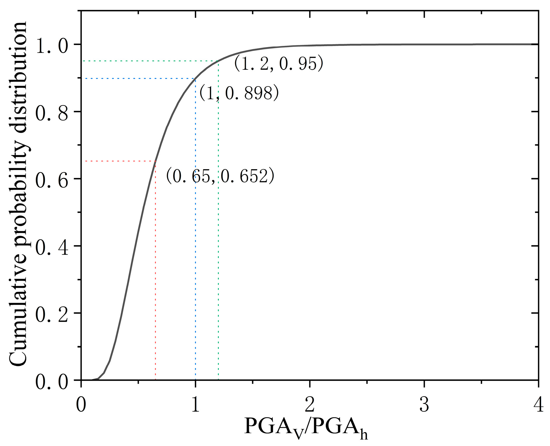 The peak ground acceleration ratio (PGAV/PGAH) exhibits significant variability and site dependence, approximately following a log-normal distribution. Both the mean value and the probability of exceeding 0.65 increase noticeably as site conditions become softer. Within the near-fault region (<20 km), the PGAV/PGAH ratio shows considerable dispersion, indicating that adopting the code-specified fixed ratio of 0.65 would significantly underestimate vertical seismic actions, thereby compromising structural seismic safety.