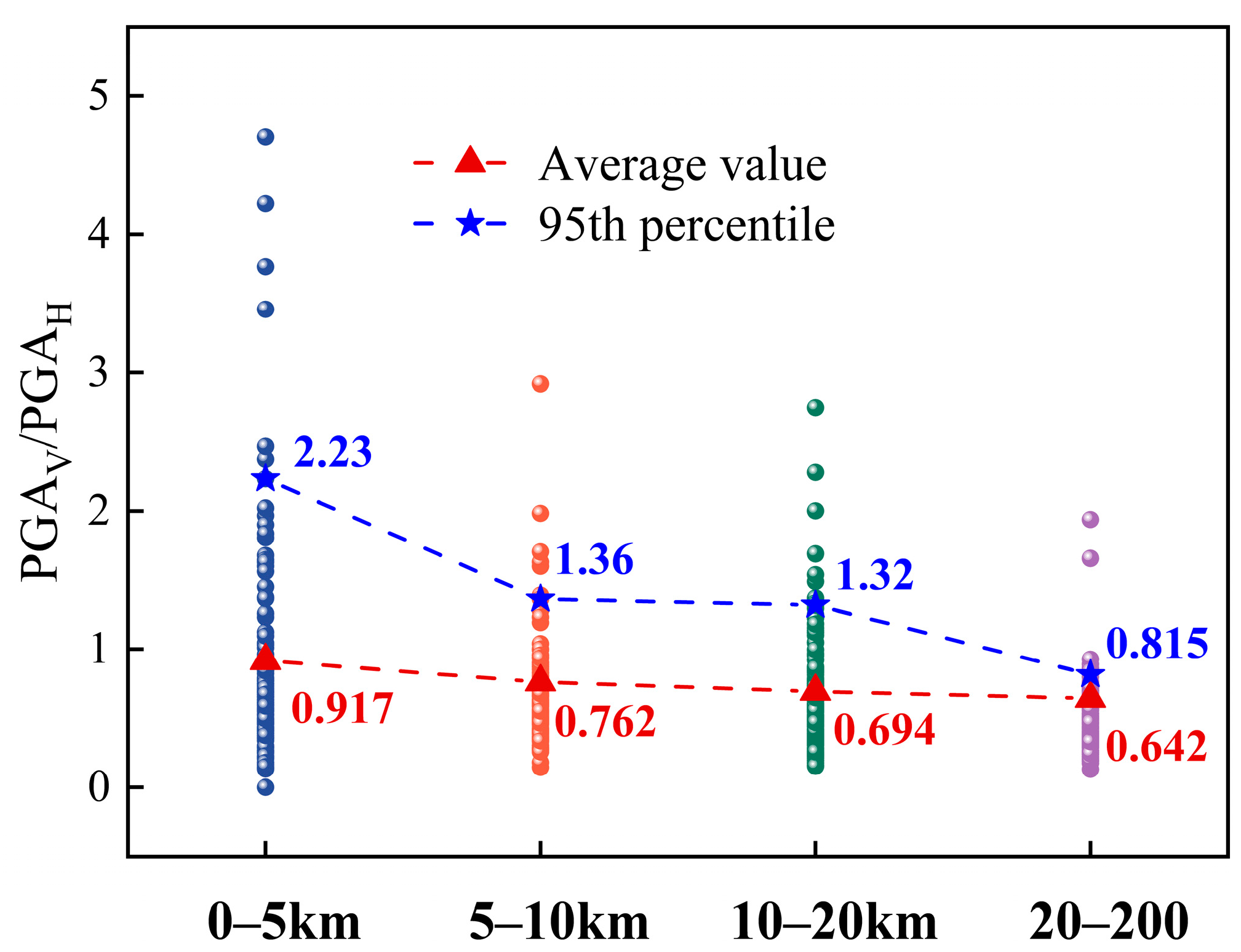 V. In this region, using a fixed ratio (such as 0.65) is highly unsafe, as it would significantly underestimate the vertical seismic action and pose a threat to structural components such as bridge bearings, columns, and shear walls. As the rupture distance increases into the intermediate- to far-field region, the pulse effects diminish, resulting in a notable decrease in the peak ratio and a reduction in data scatter.