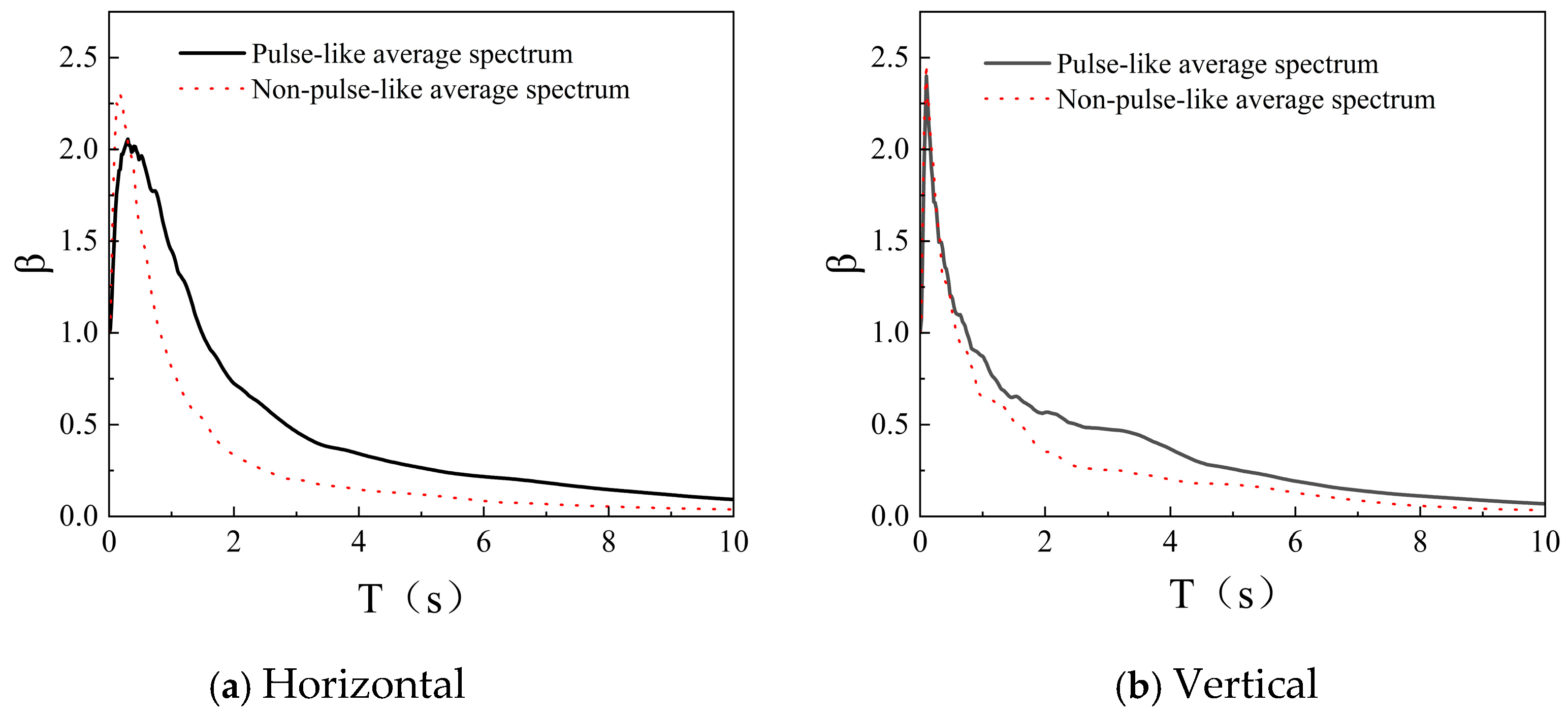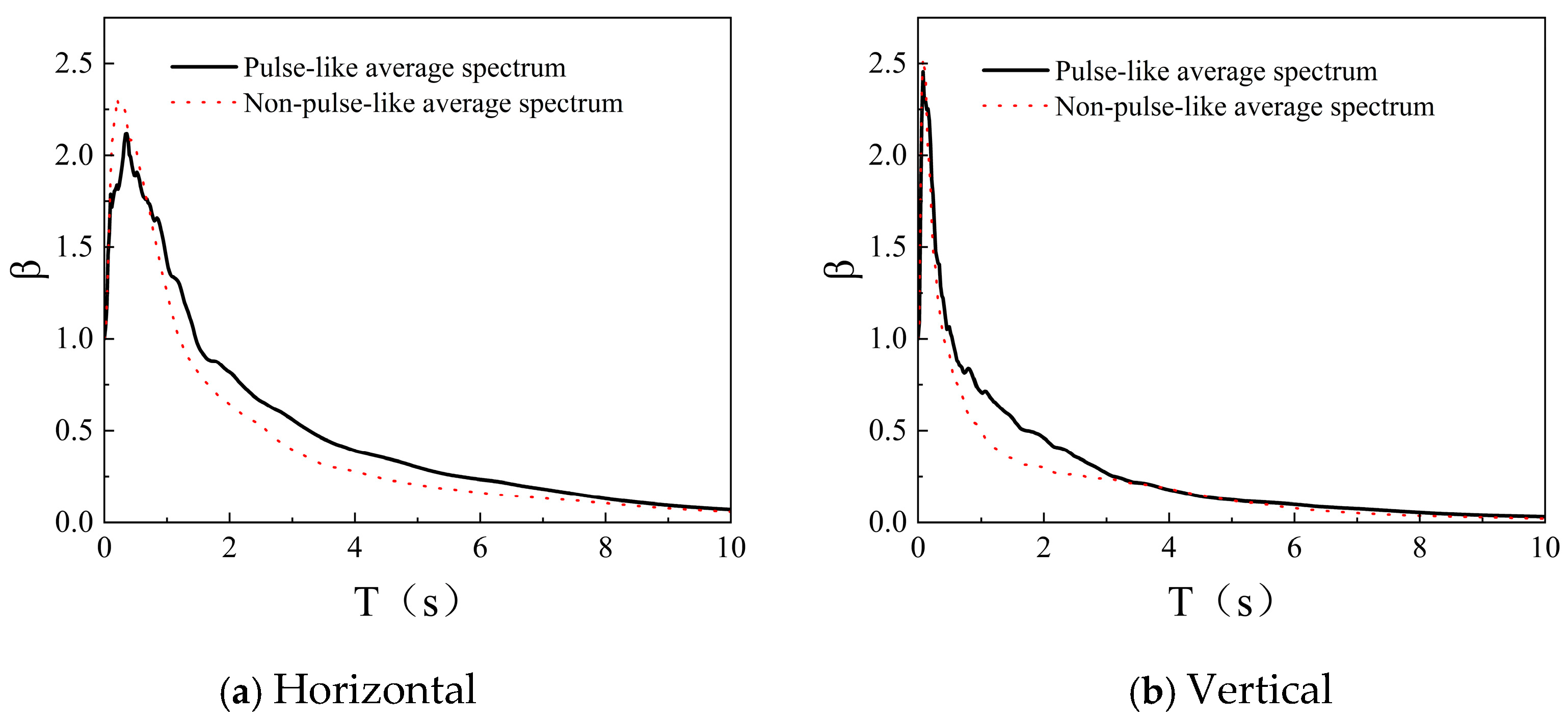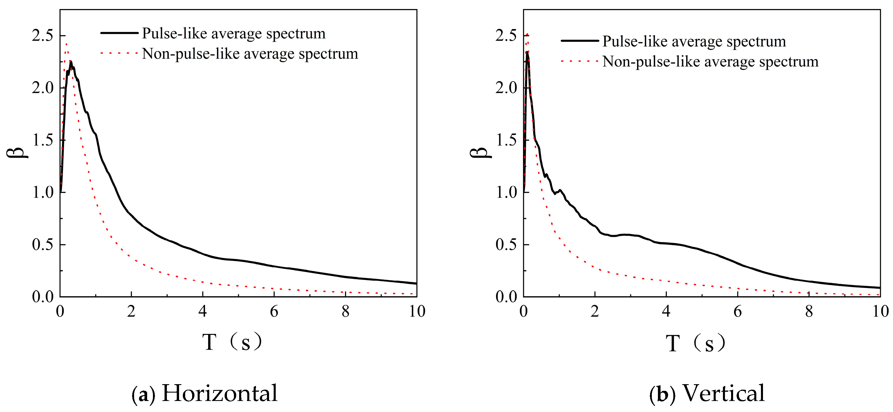 The selected ground motion records in this study are categorized based on Site Classification, pulse characteristics, and component direction (horizontal or vertical). Specifically, the records are first classified according to Site Classes I, II, and III. Within each Site Class, they are further subdivided based on whether they exhibit pulse-like features and by their horizontal or vertical component orientation. For each ground motion record, the elastic acceleration response spectrum is computed with GMSignal, a specialized and widely recognized software for seismic engineering applications. Each spectrum is then normalized by dividing it by the corresponding peak ground acceleration (PGA) of the record, resulting in the dynamic amplification factor β(T). This process generates normalized response spectrum curves, assuming a damping ratio of 0.05. Finally, the normalized spectra are averaged within each category to produce the final data curves, as shown in