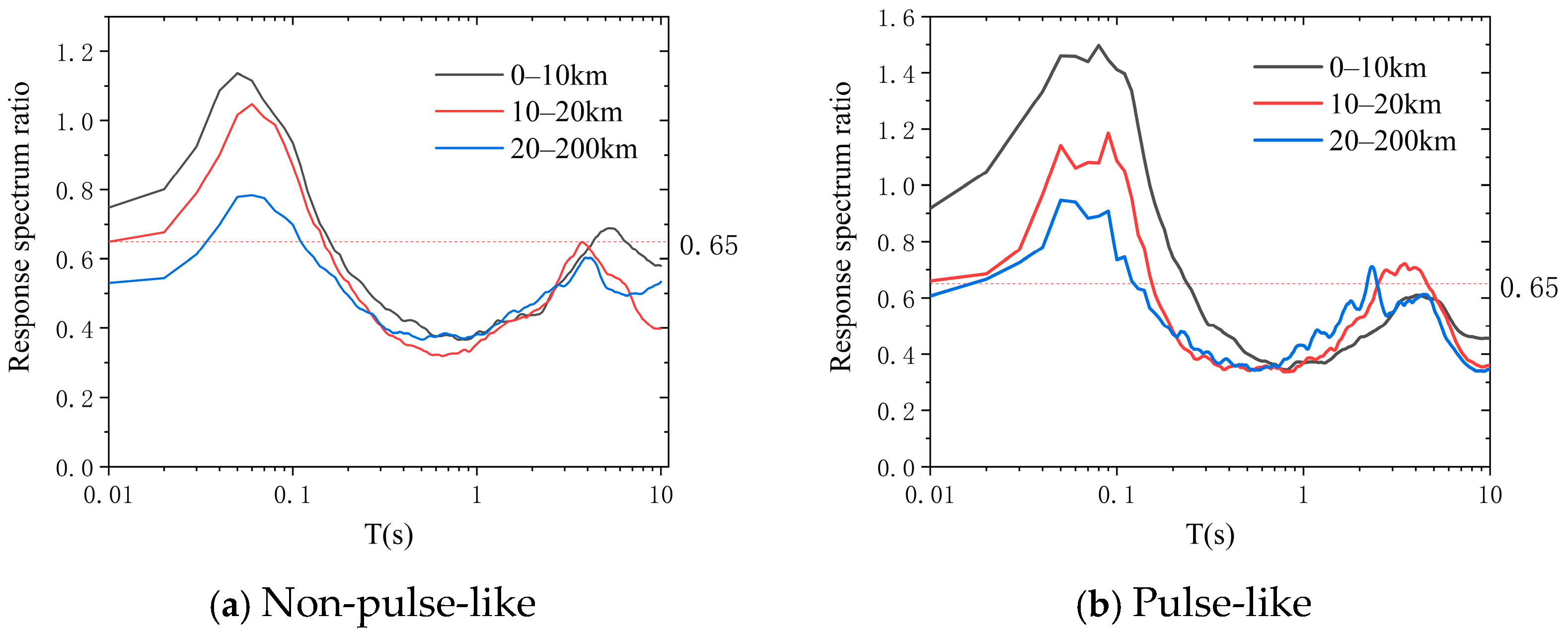 Furthermore, the pulse effect significantly alters the distribution of the vertical-to-horizontal (V/H) response spectral ratio across periods. Comparative analysis clearly shows that the spectral ratio for pulse-like ground motions is markedly higher than that for non-pulse-like records. This discrepancy is particularly pronounced in the short-period range (T < 0.3 s), where the pulse effect leads to a substantial increase in the ratio, resulting in a prominent peak plateau that often significantly exceeds 1.0 and can reach values above 2.0. This phenomenon reflects a resonance effect between the high-frequency components of the pulse and the characteristics of vertical ground motion.