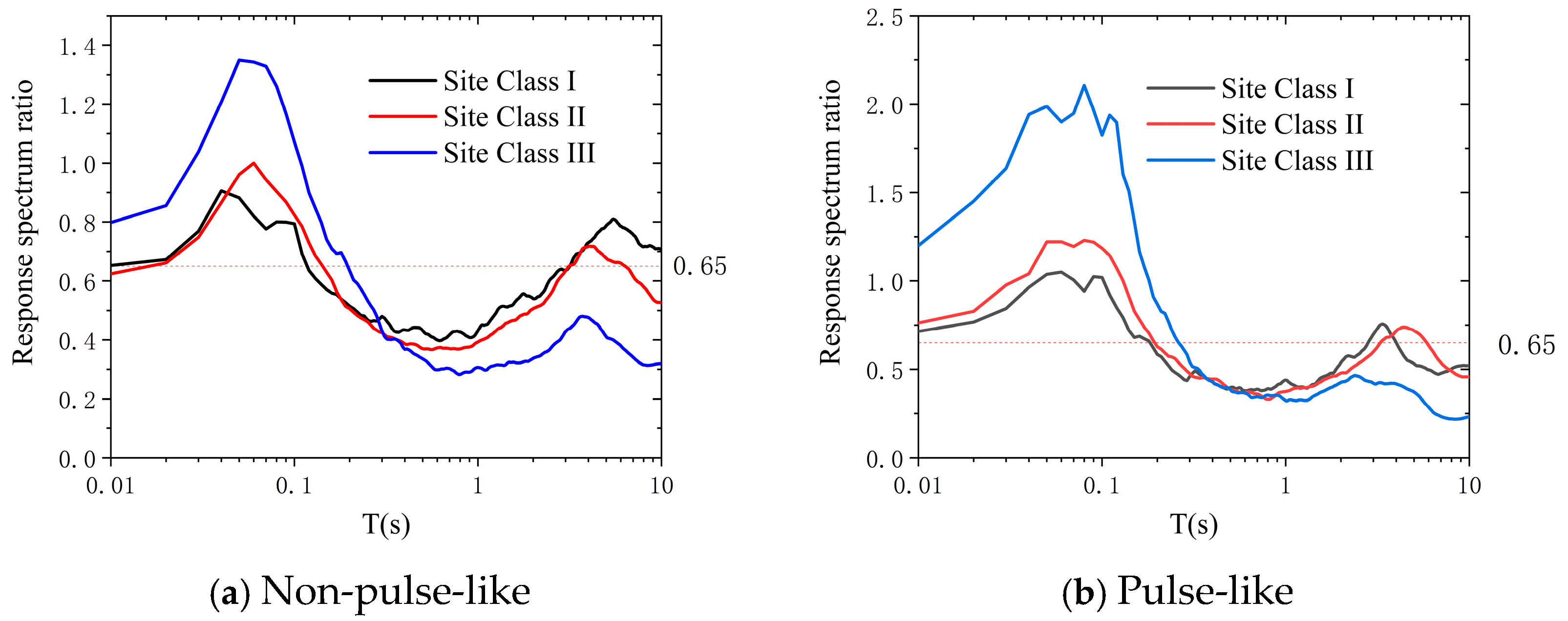 The vertical-to-horizontal response spectrum ratio exhibits significant period sensitivity, following a general trend of “short-period amplification, intermediate-period transition, and long-period decay.” Within the short- to intermediate-period range, the ratio often exceeds 1.0, with maximum values reaching 1.5–2.0. The pulse effect further amplifies the ratio in the short-period range, and soft site conditions (Site Class III) also significantly elevate spectral ratios, indicating rich high-frequency energy content in the vertical component of near-fault ground motions.