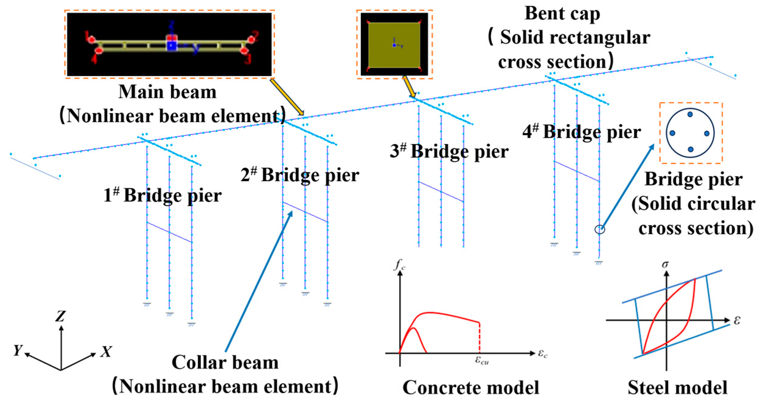 A three-dimensional full-bridge simulation model was developed using the finite element analysis platform Midas Civil 2023 (v3.1). The pier columns were modeled as nonlinear beam-column elements with circular cross-sections, utilizing the Concrete04 constitutive model for concrete and the Steel02 model for longitudinal reinforcement. The girder and cap beams were simplified as nonlinear beam elements. Both the piers and girder components were simulated using spatial beam elements. The laminated rubber bearings in the prototype structure were simulated using elastic link elements. This modeling approach allows for the definition of independent stiffness values in all six degrees of freedom, enabling a precise representation of the bearing’s primary directional mechanical properties. The key mechanical parameters were determined based on the material characteristics and geometric dimensions of the bearings. This method enables an effective analysis of the internal forces and deformations in the bearings under both static and dynamic loads, thereby providing a reliable computational basis for the overall structural response of the bridge. In terms of boundary conditions, fixed constraints were applied at the abutment foundations and the bottom of the piers to accurately reflect the influence of actual support conditions on the structural dynamic characteristics.