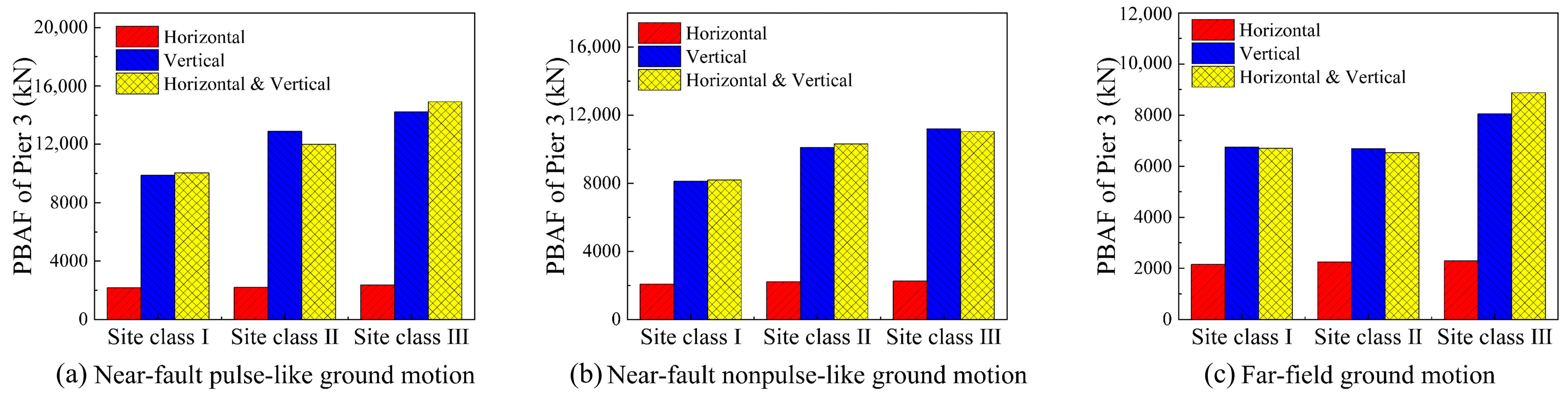 Figure 12, under various site conditions, the axial force at the pier base induced solely by vertical ground motions is significantly greater than that resulting from horizontal motions alone, yet remains comparable to the response under combined loading. This suggests that vertical seismic action plays a dominant role in the axial force response of the pier. As site conditions become softer, the axial force exhibits an increasing trend. This behavior can be attributed to the filtering and amplification effects of different soil types on seismic waves: soft soils (Site Class III) enrich the low-frequency components of ground motions, thereby amplifying the vertical vibrational response of the bridge. Furthermore, the axial forces under near-fault pulse-like ground motions are generally higher. Characterized by high energy content, long-period components, and short-duration intense impulses, such motions significantly amplify the axial force demand at the pier base.