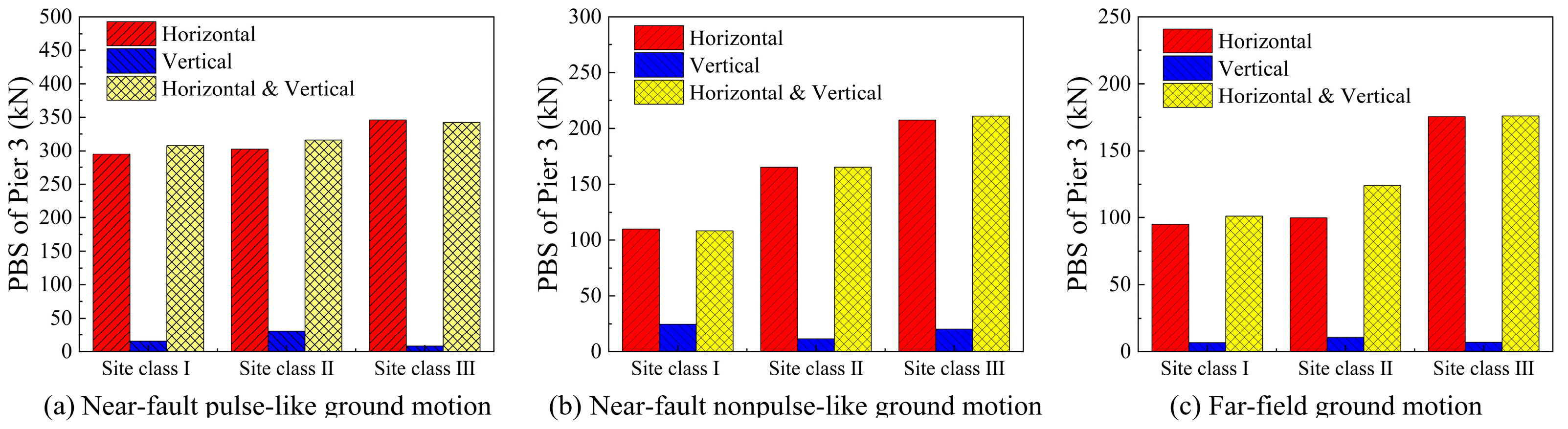 Figure 13. This indicates that the horizontal seismic component dominates the shear force response in the piers. The base shear force in Site Class III is markedly higher than that in Site Classes I and II. Particularly under near-fault non-pulse ground motions, the base shear in Site Class III exceeds that in Site Class I by approximately 83.7% and surpasses Site Class II by about 21.9%. This demonstrates the stronger amplification effect of soft soil sites (Site Class III) on the structural response, primarily attributable to the filtering and amplification of seismic waves by different soil layers. Soft soils typically amplify long-period components, which may approach the fundamental natural period of the structure. Furthermore, pulse-type ground motions generally in-duce higher base shear forces. The horizontal shear forces under pulse-like motions are amplified by factors of 2.53, 1.78, and 1.38 in Site Classes I, II, and III, respectively, compared to their non-pulse-like counterparts. The high-energy, long-period pulse components inherent in near-fault ground motions can trigger intense quasi-resonance phenomena when the predominant pulse period closely matches the fundamental natural period of the bridge structure, leading to a substantial increase in pier base shear.